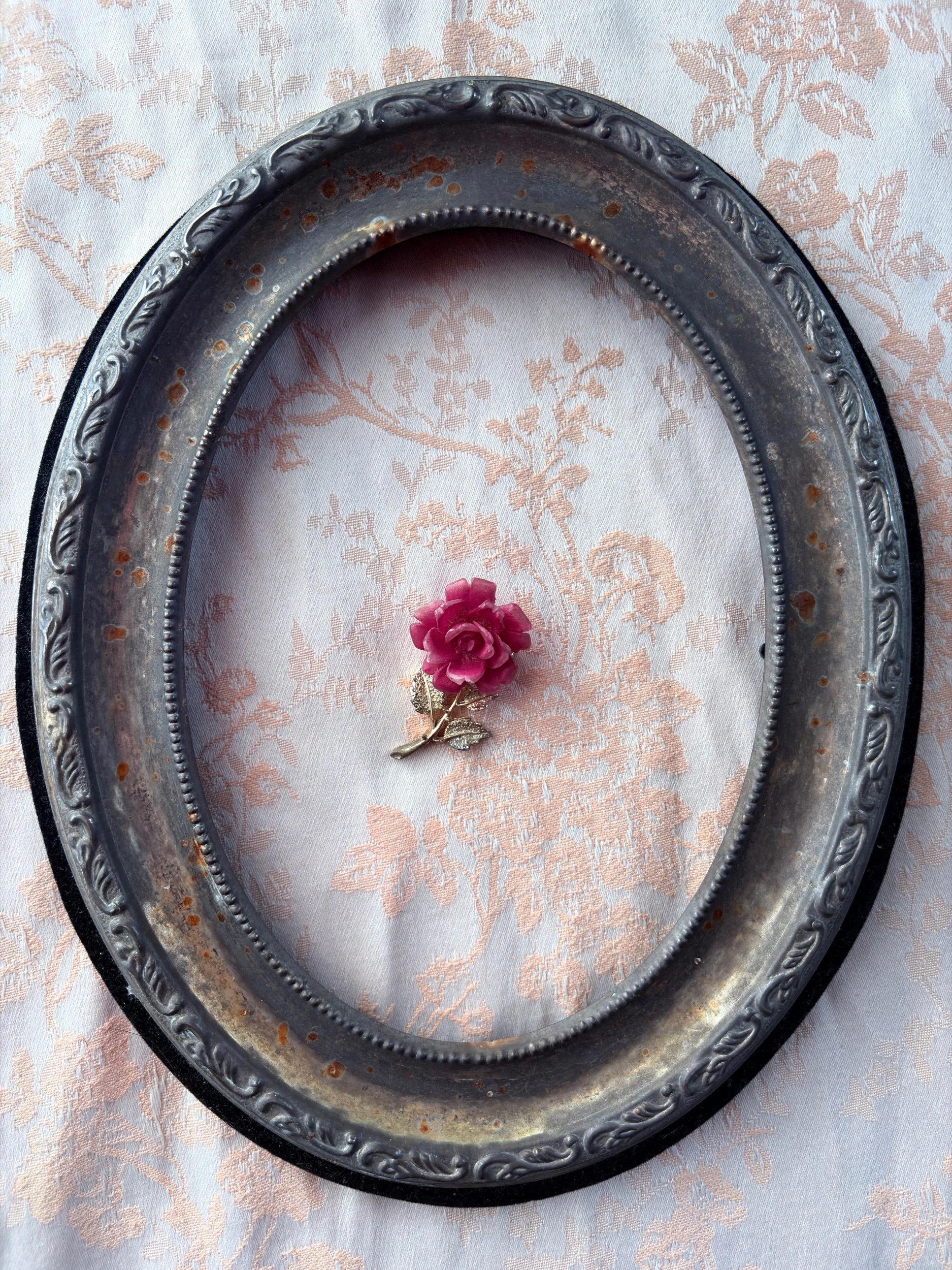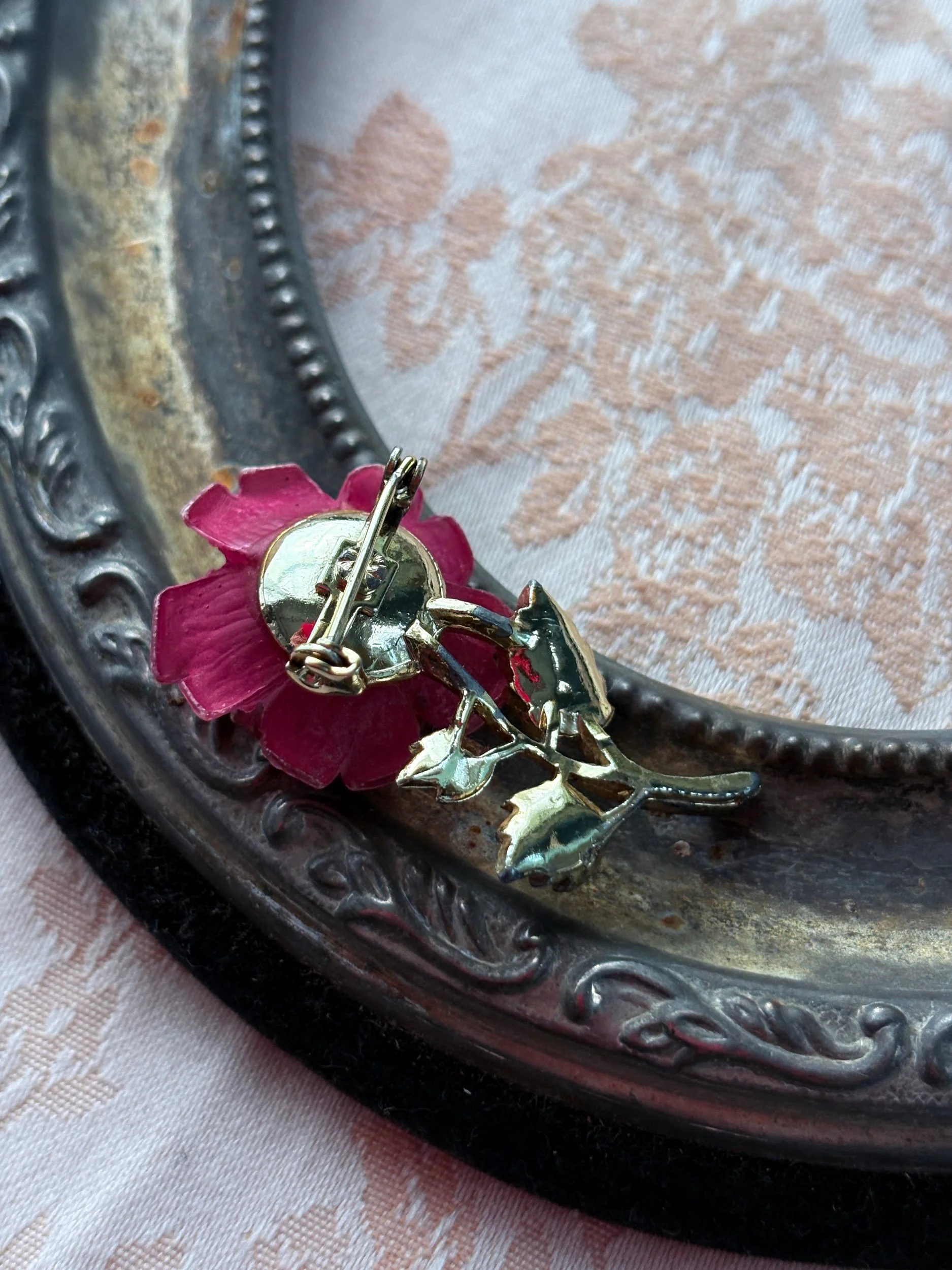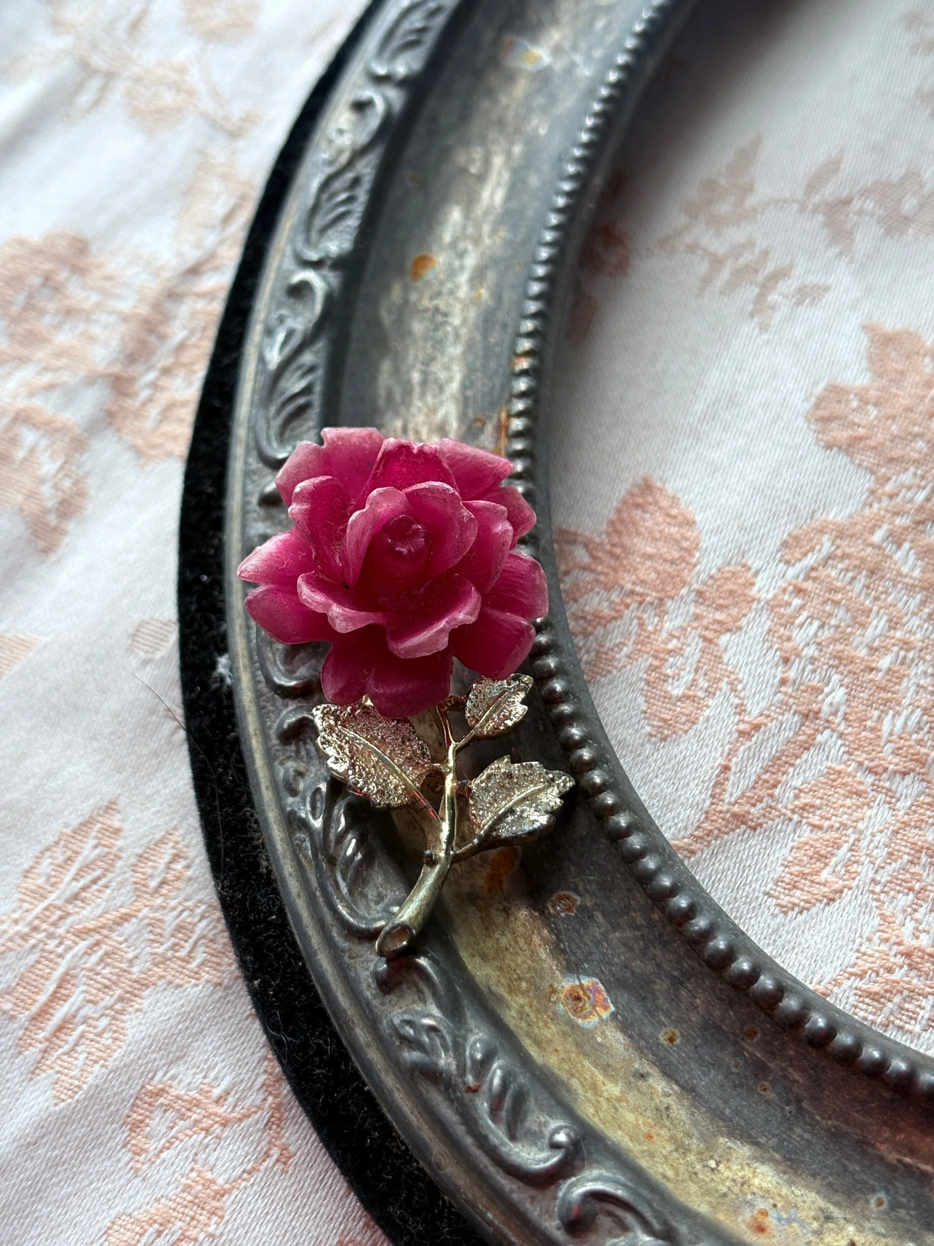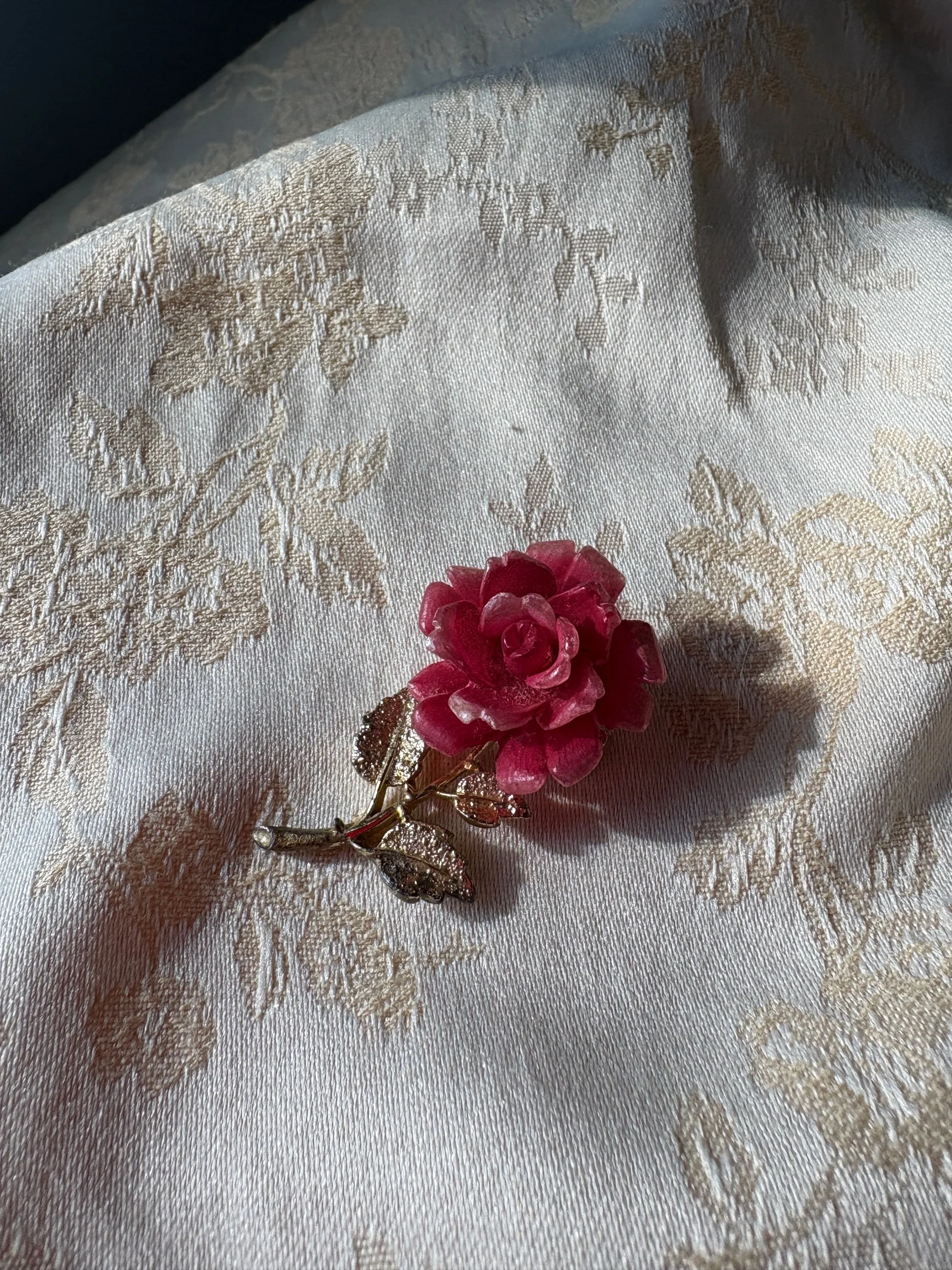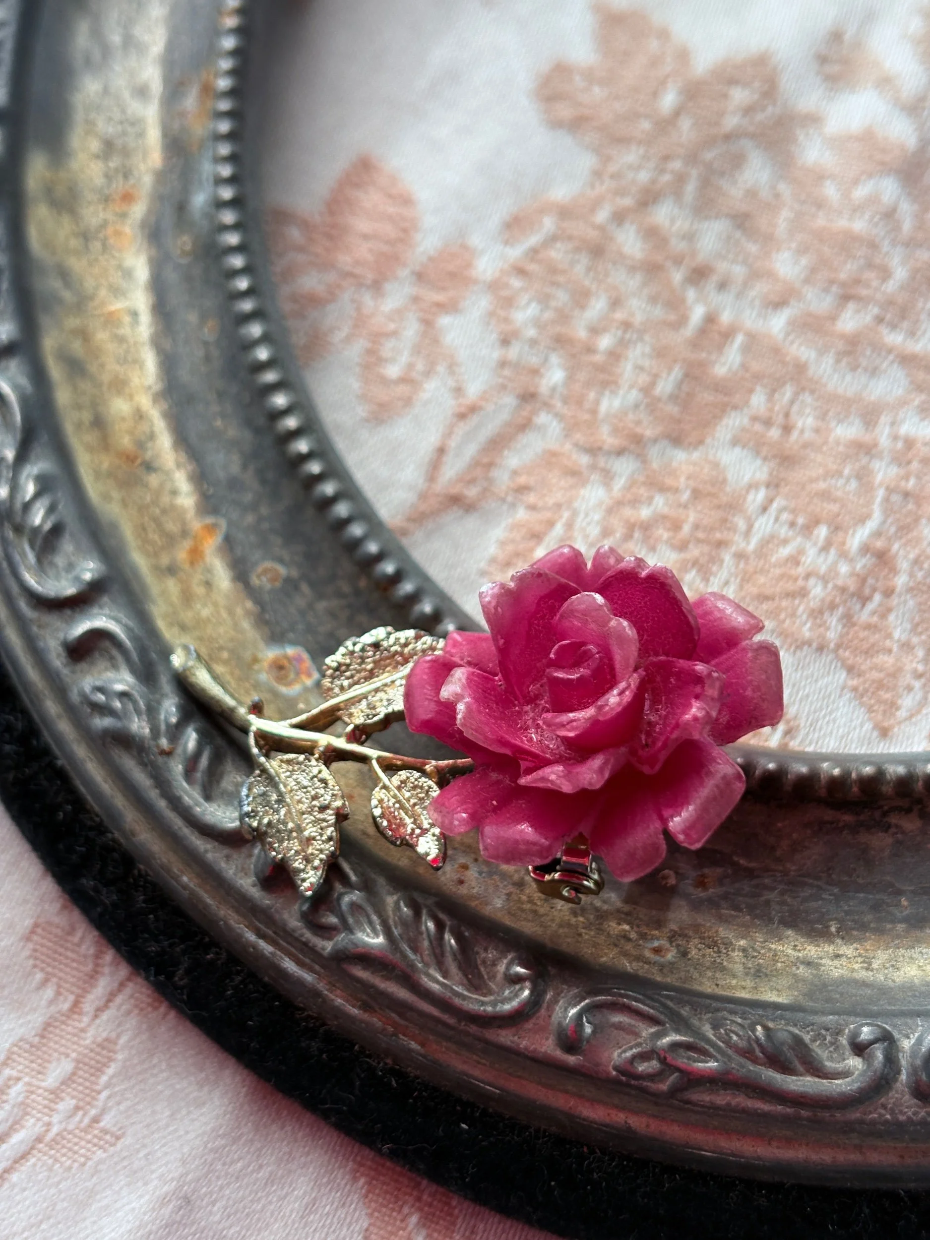 A single rose, forever in bloom. This vintage brooch features a sculpted deep-raspberry rose set on a gold-tone stem with textured leaves. Romantic and a little dramatic, it’s the perfect accent for a lapel, coat, knit dress, or beret—very The Nightshade Effect.