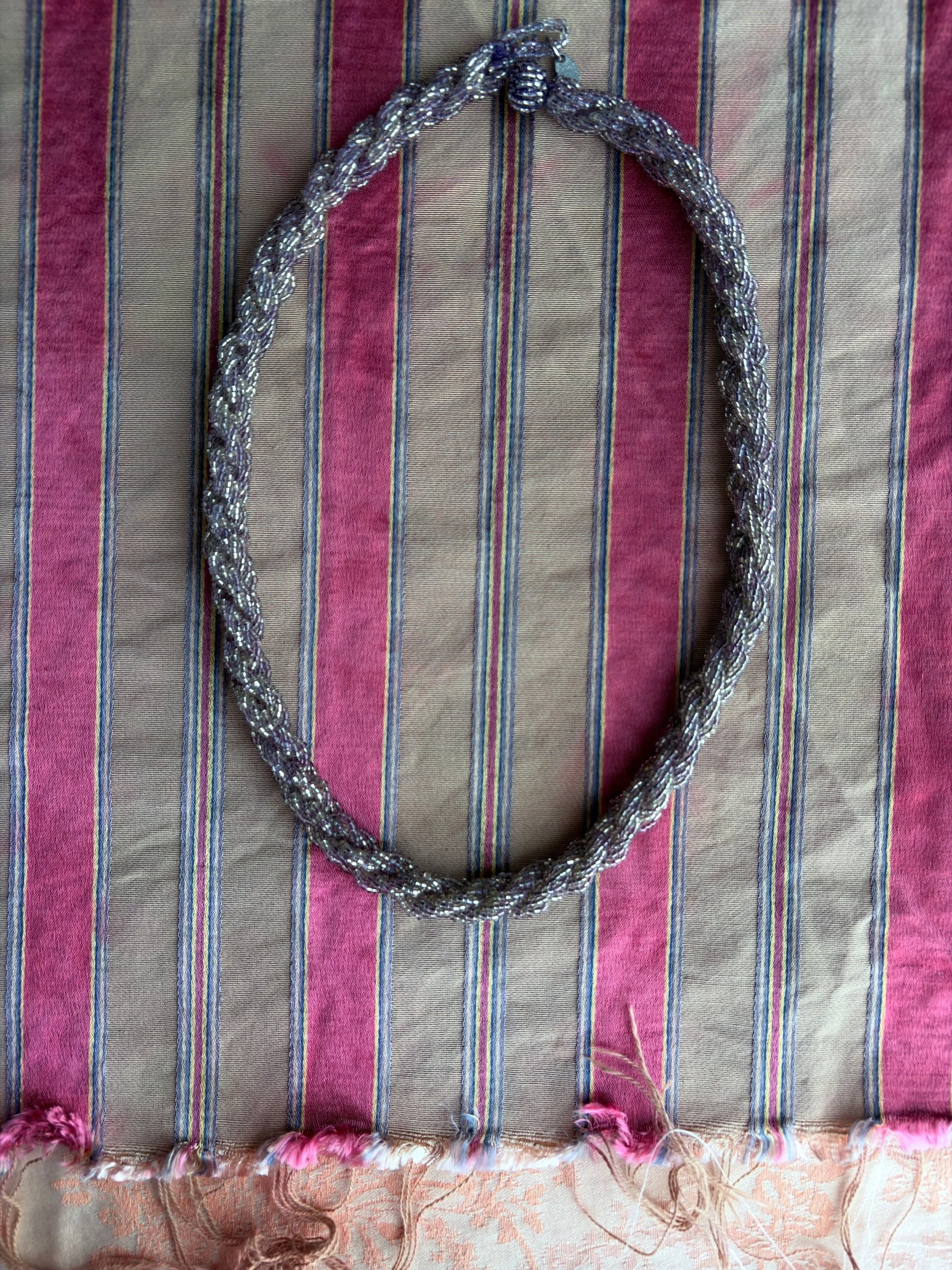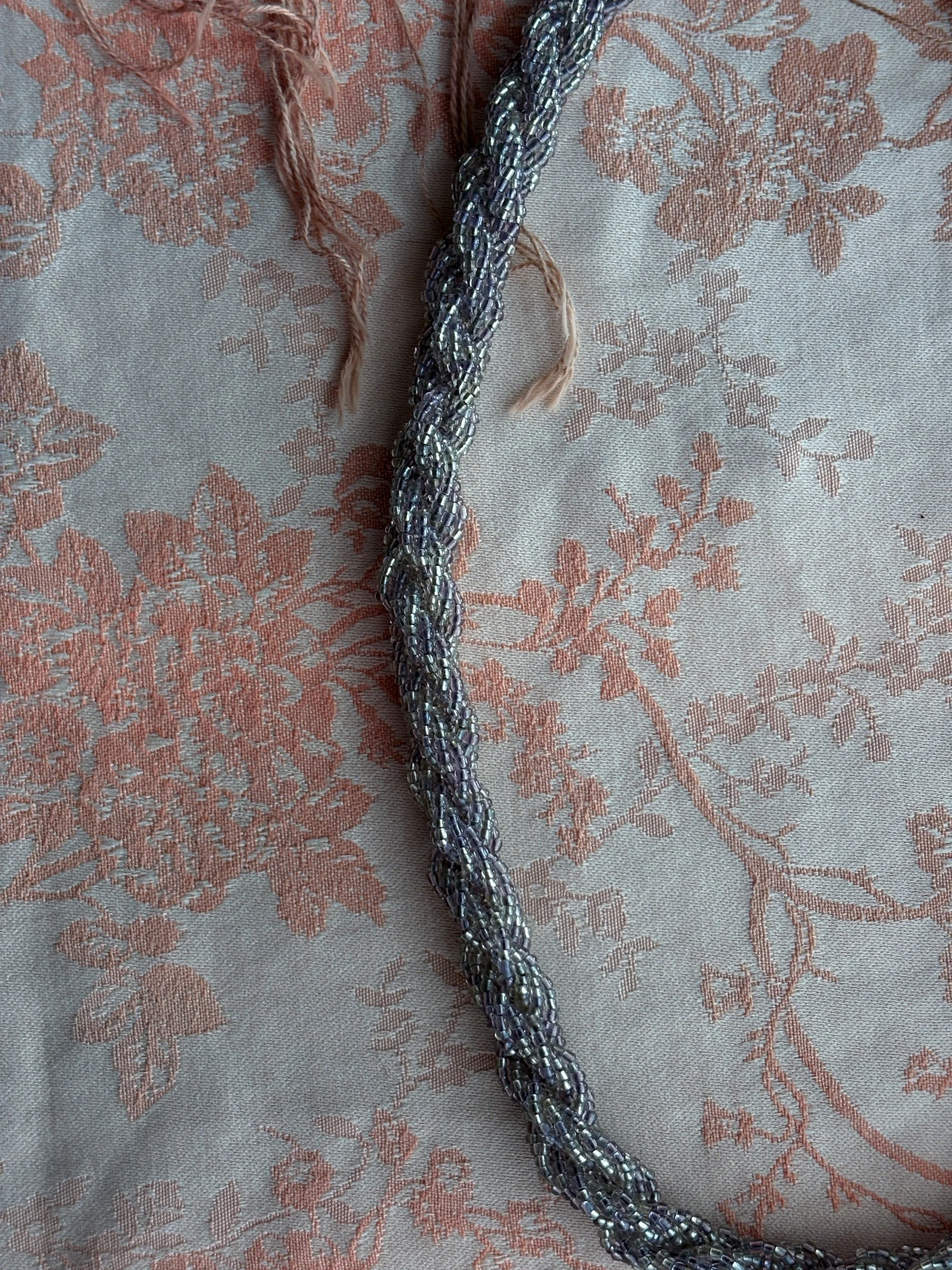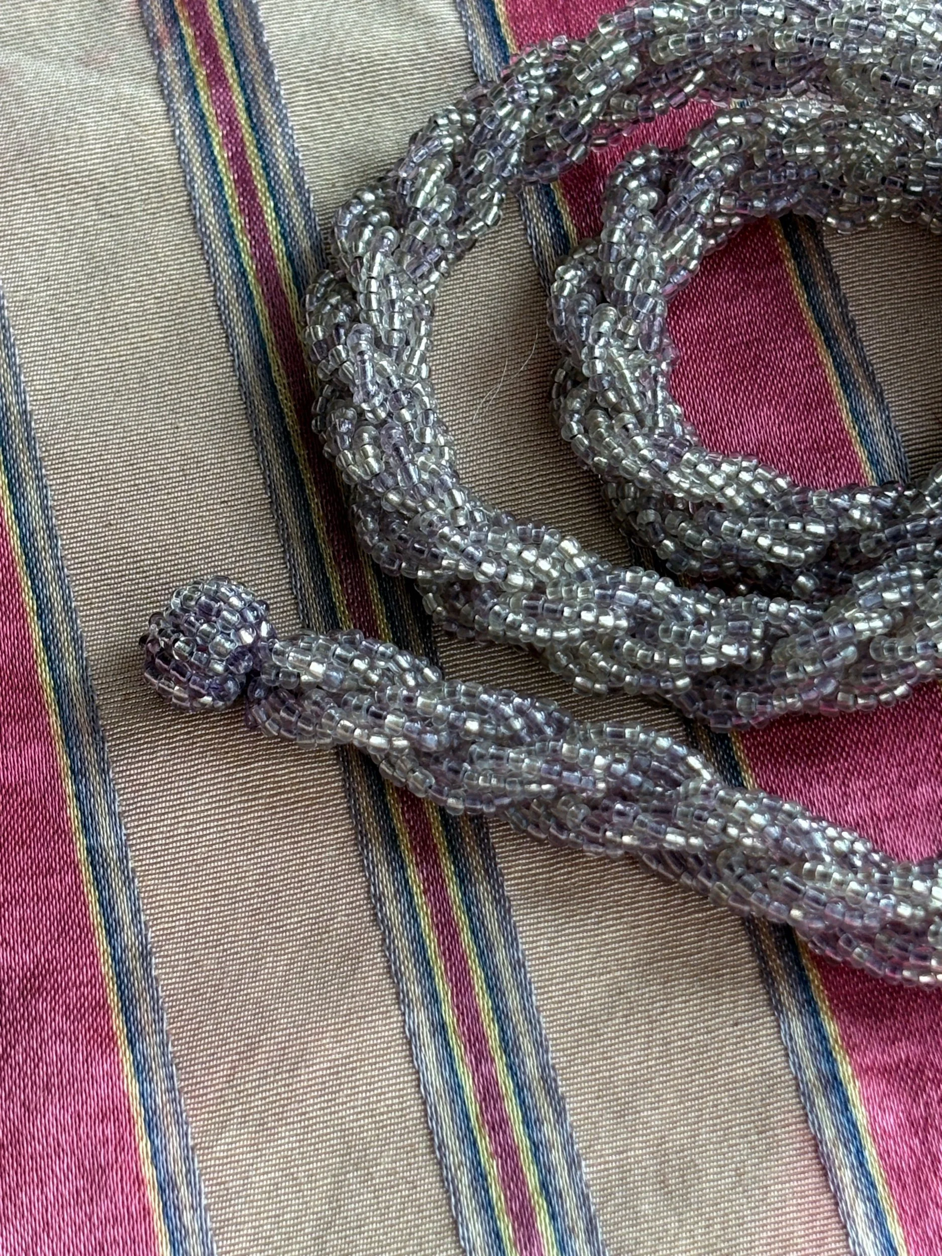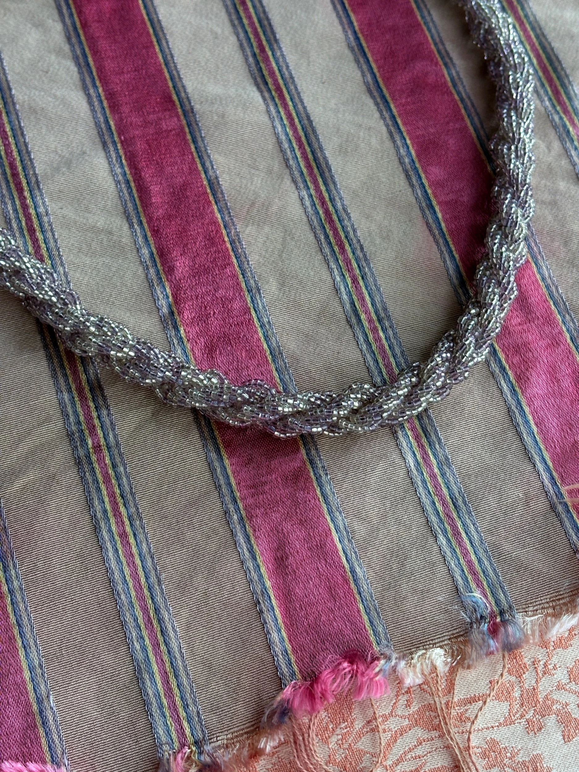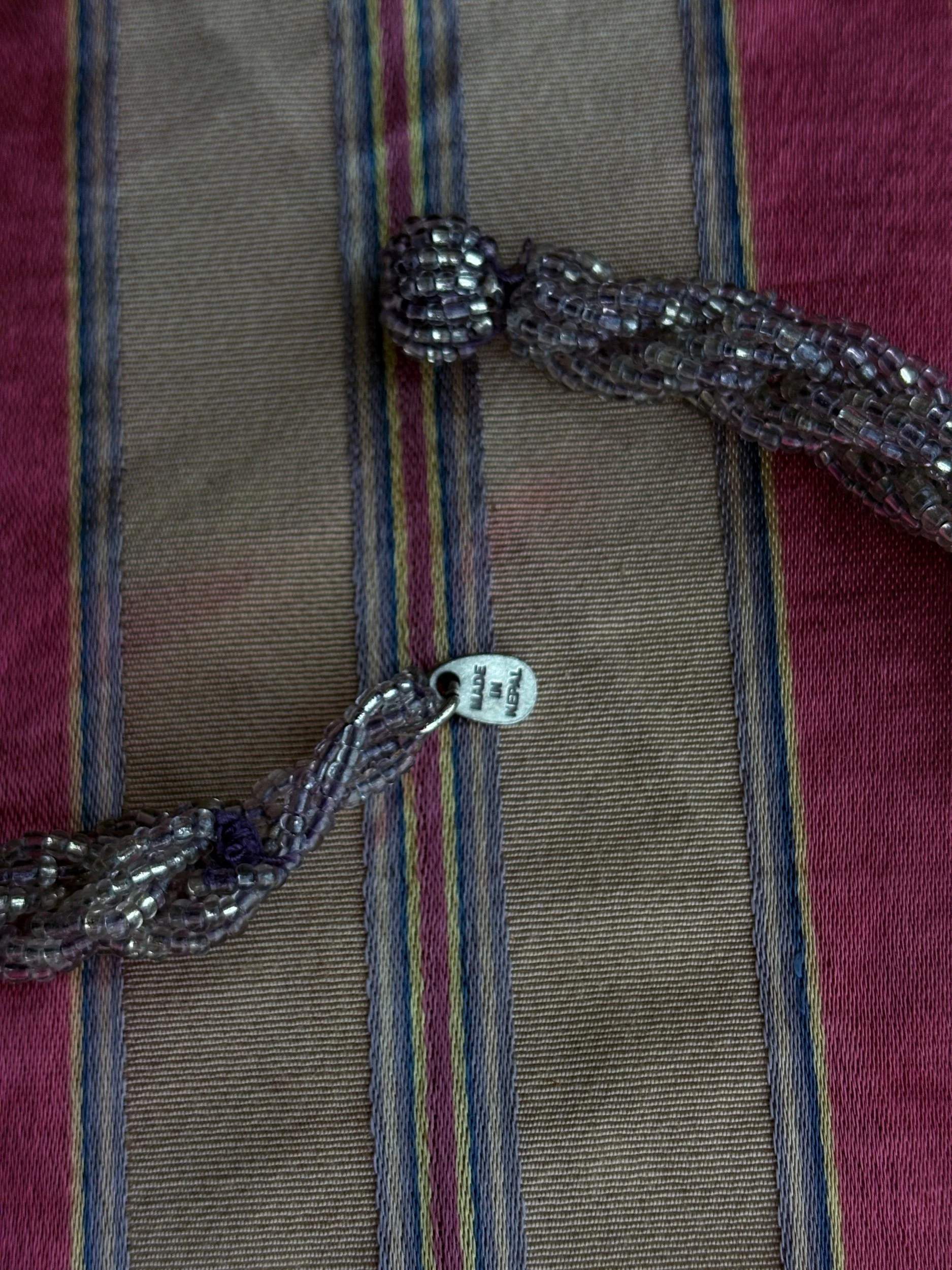 This exquisite, handcrafted braided necklace originates in Nepal and is crafted from hundreds of luminous glass seed beads in soft lavender and silver hues. Each strand is meticulously woven, creating a textured, rope-like appearance that exudes both artisanal charm and sophistication.