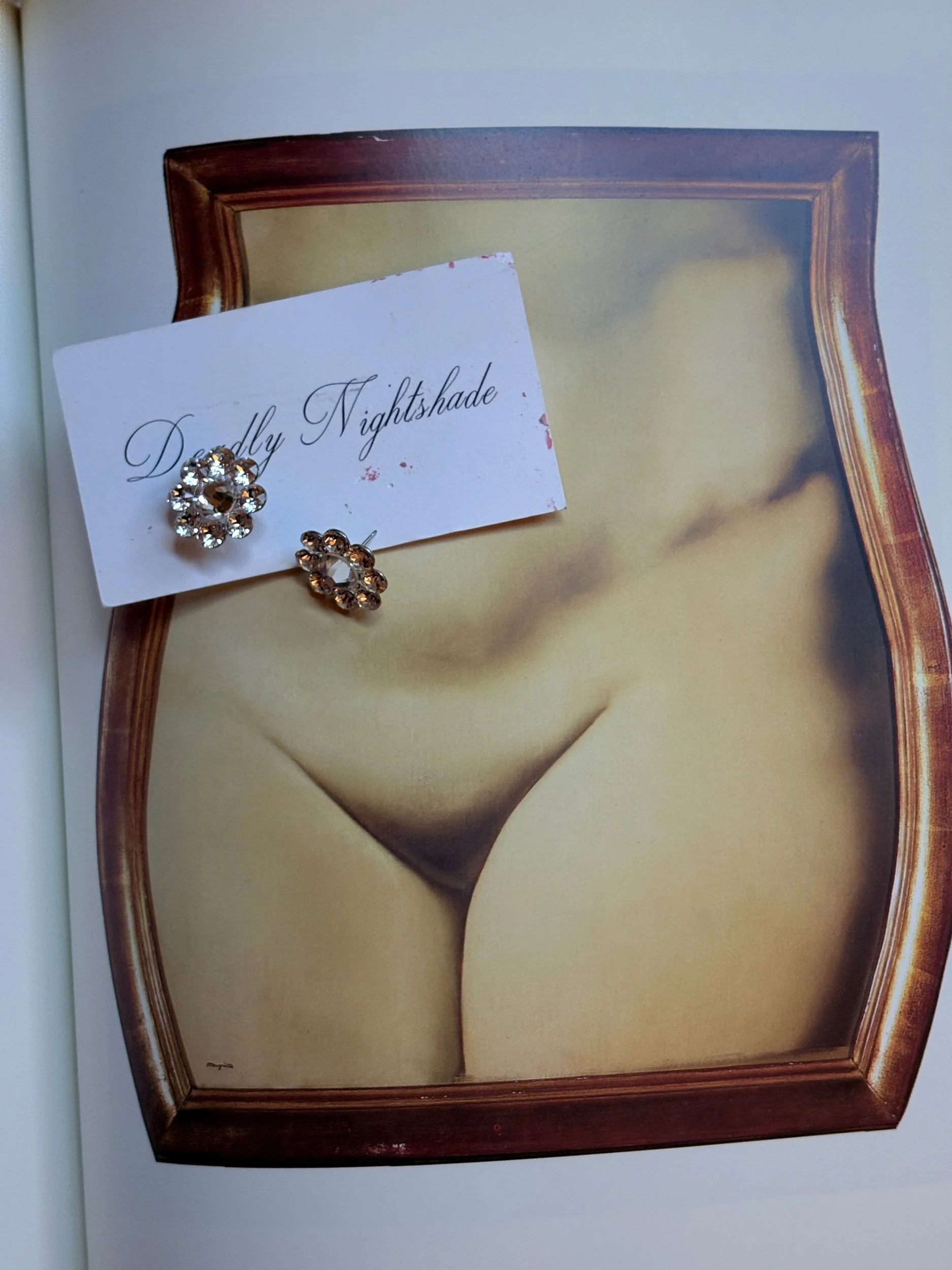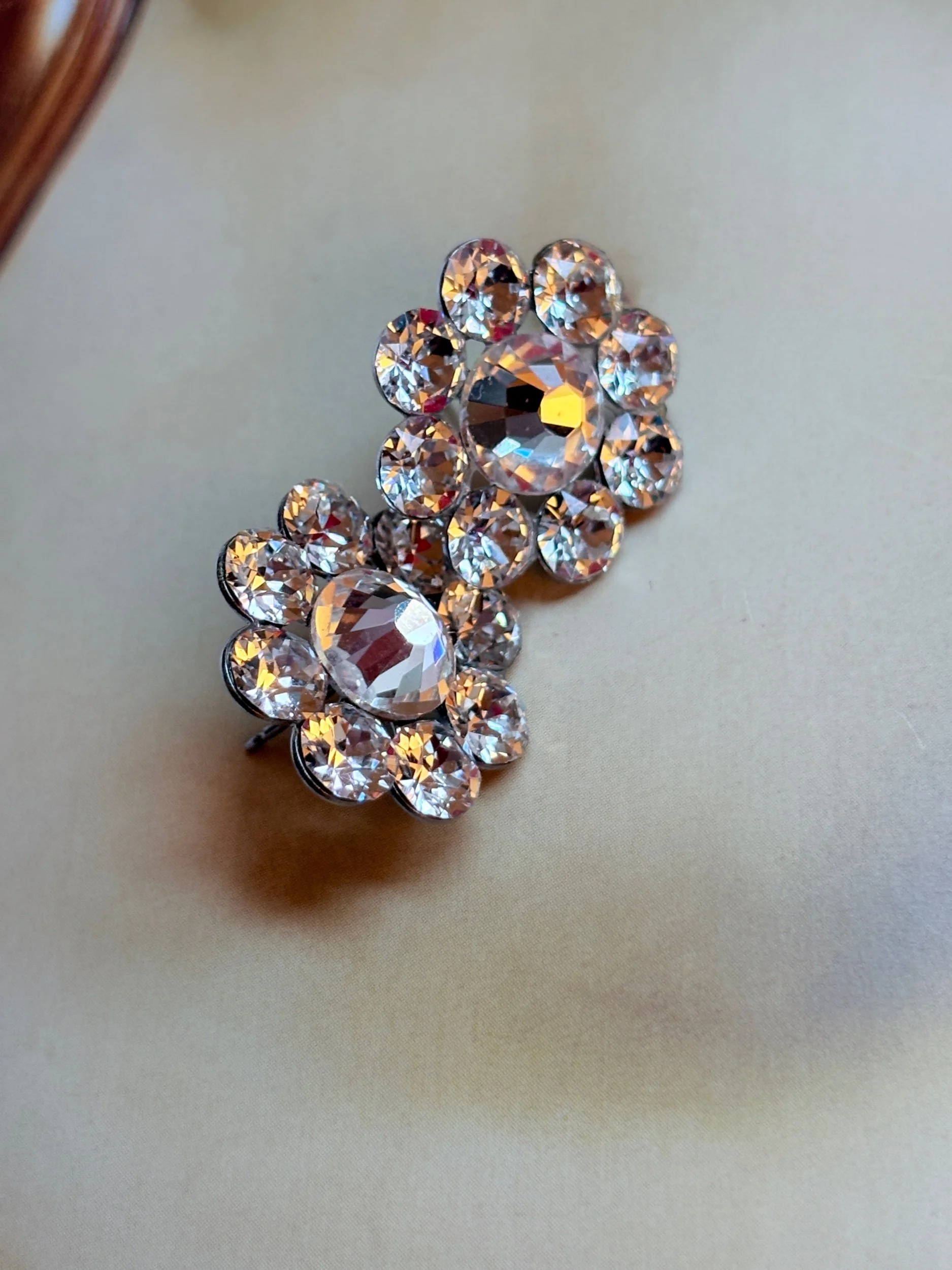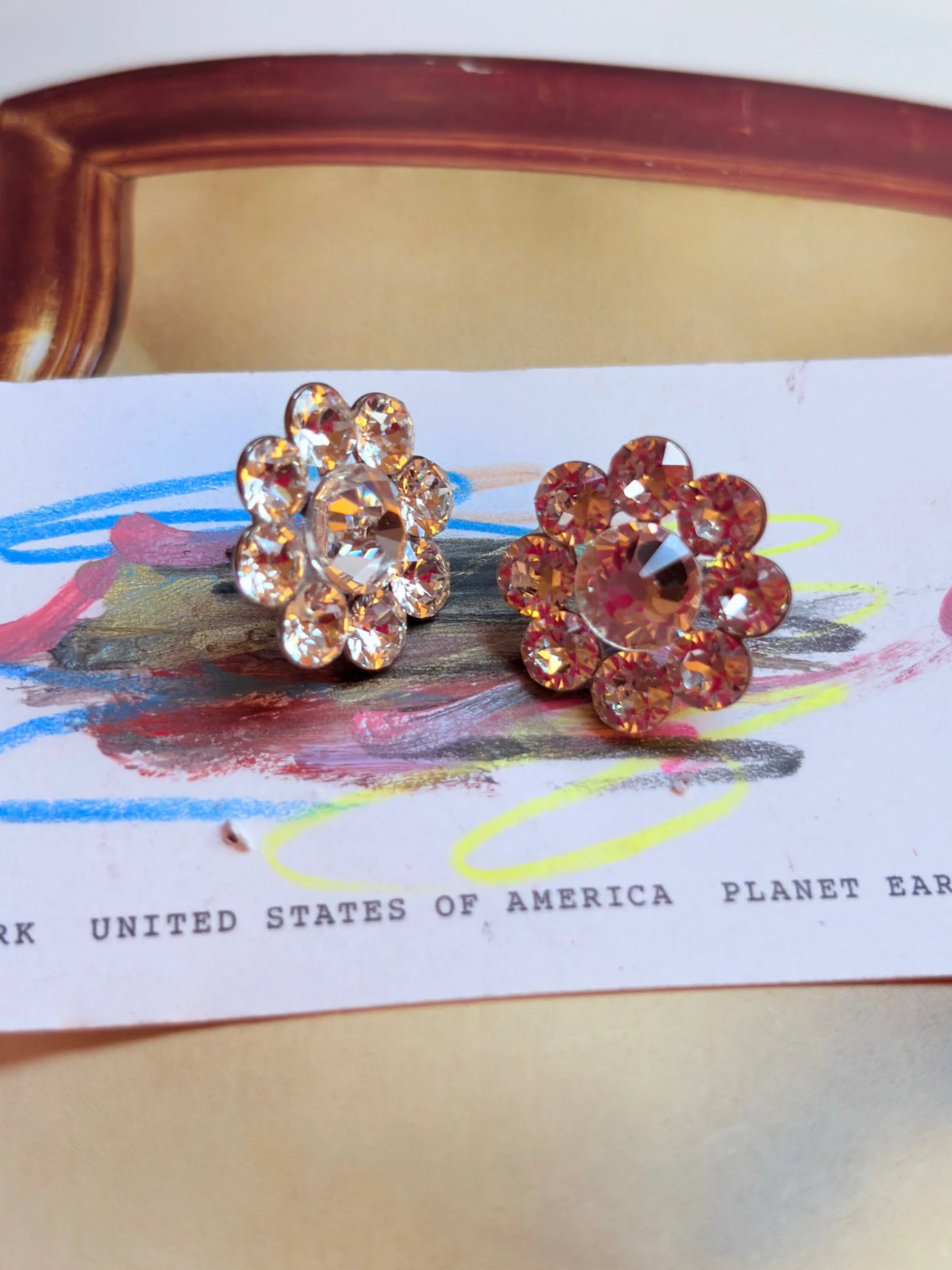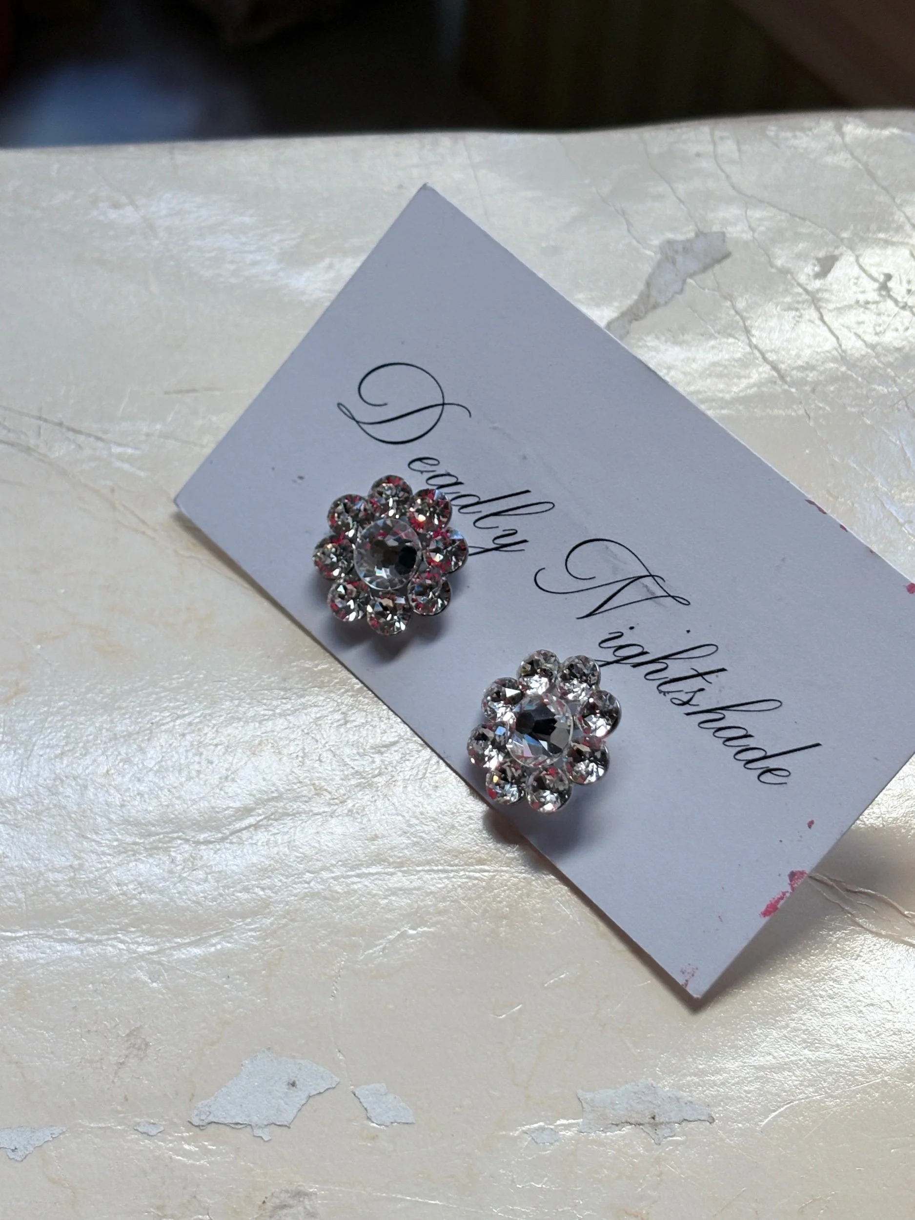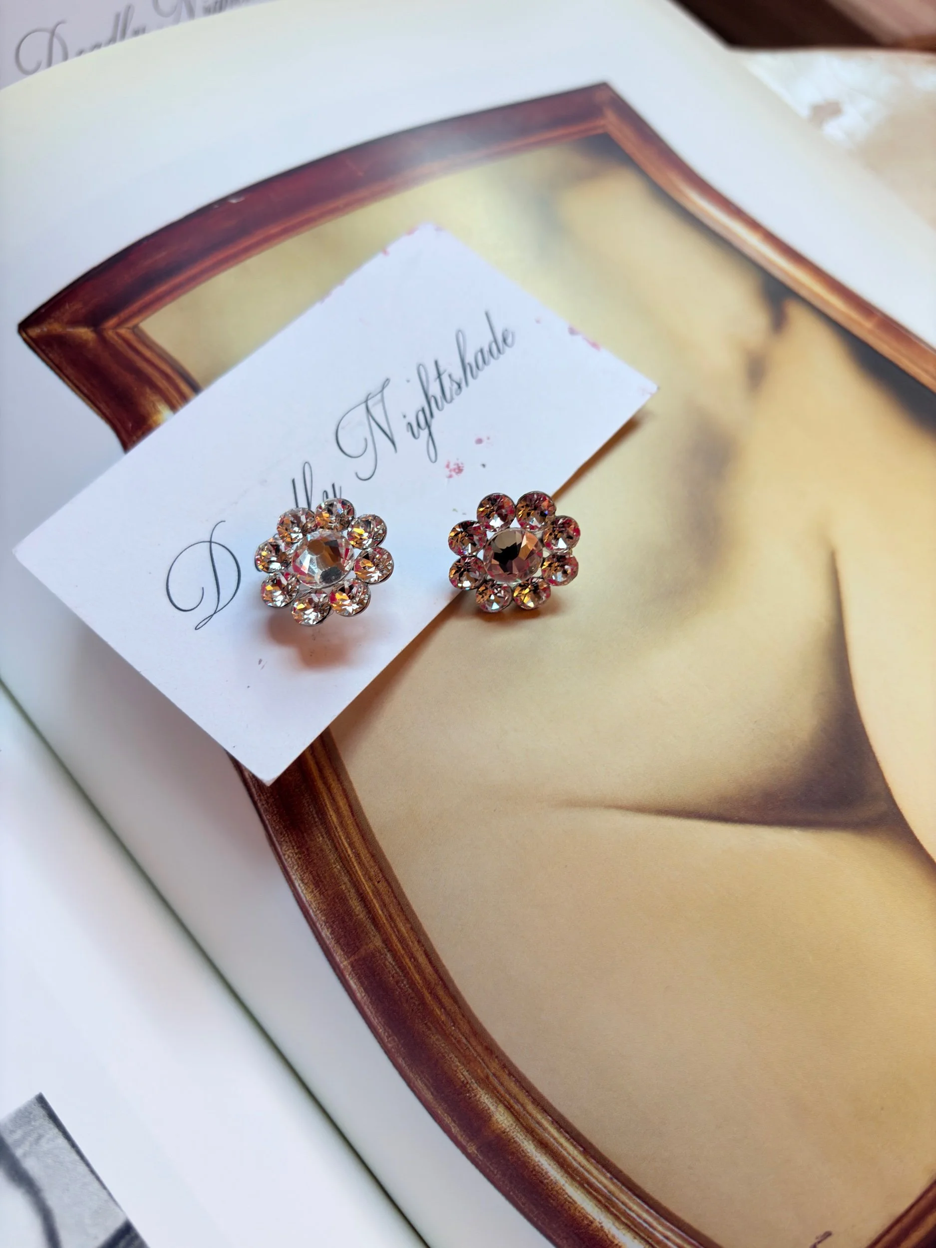 A classic flash of light with a Nightshade edge—these crystal bloom studs bring a soft vintage shimmer to any look. Each earring features a faceted center stone framed by a halo of petite crystals, creating a dimensional floral silhouette that catches and reflects light beautifully.