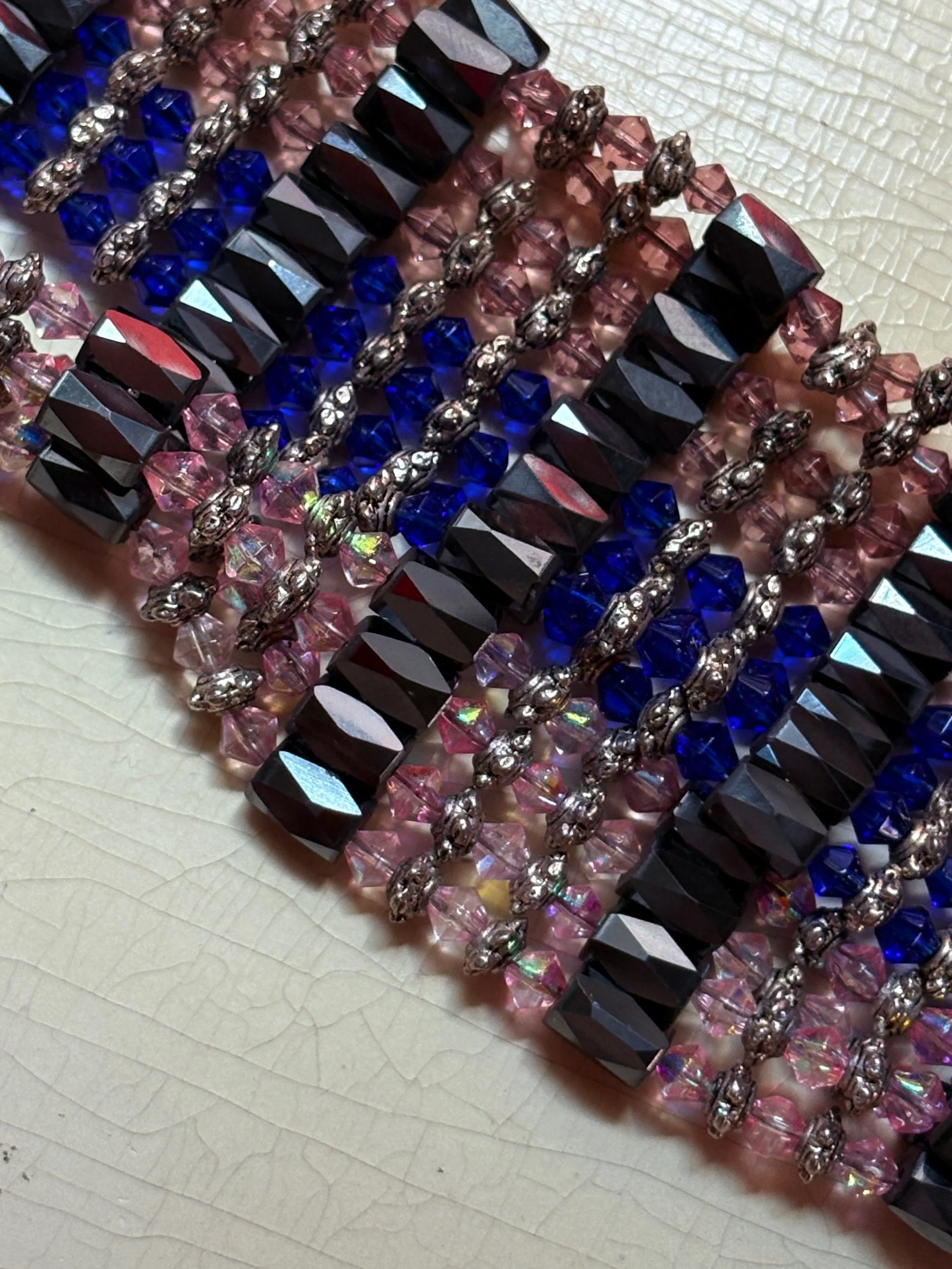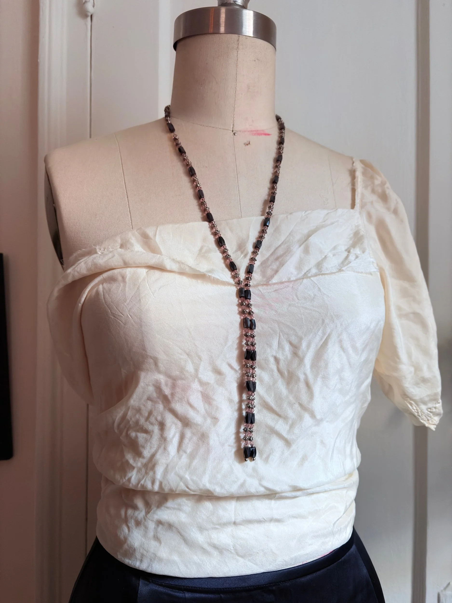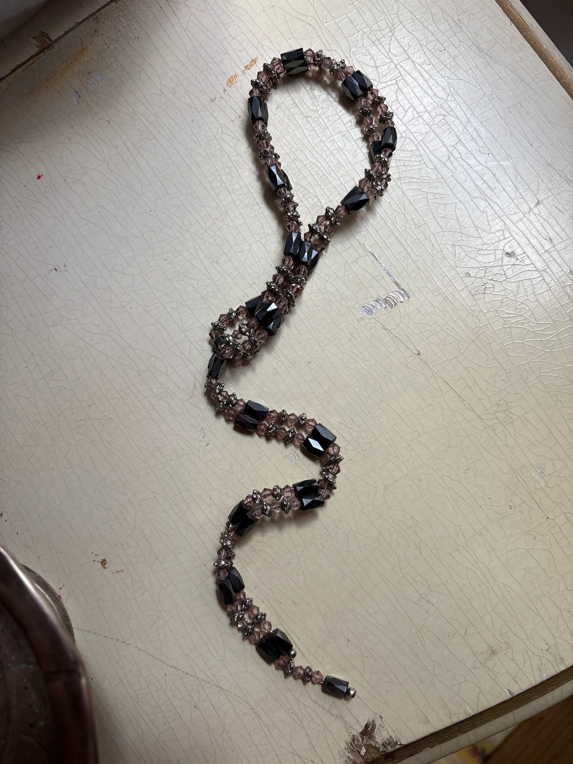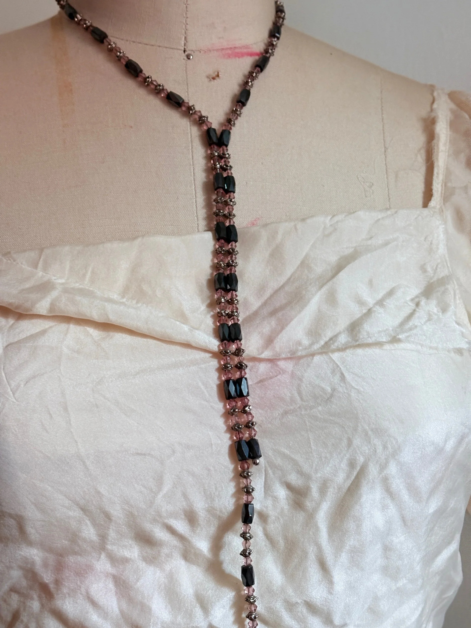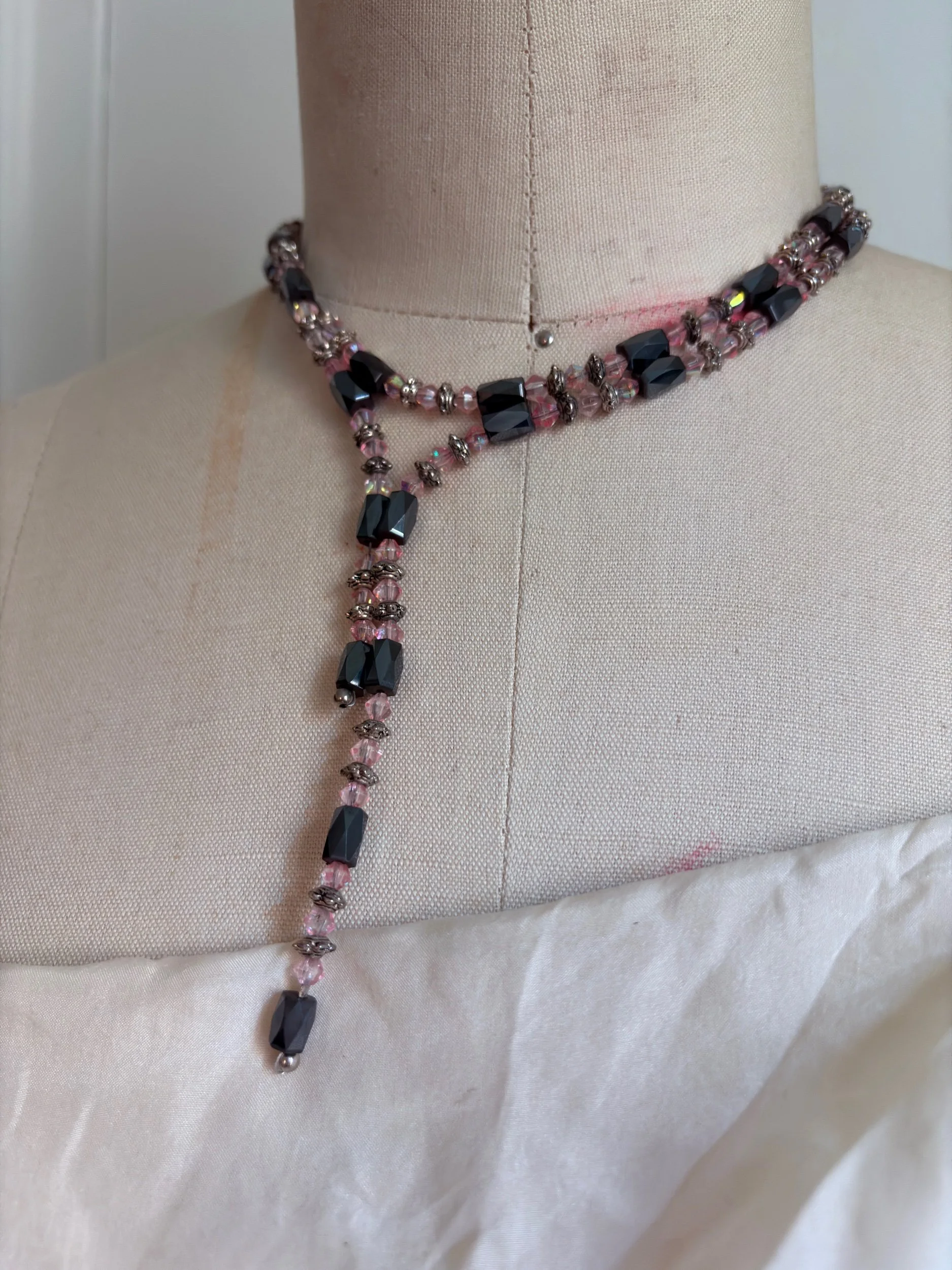 Bright crystals meet deep hematite tones in this statement lariat—an elegant collision of shadow and shimmer. Designed with magnetic connectors that allow multiple ways to wear it: doubled as a choker, extended as a lariat, or wrapped as a bracelet for a layered cuff effect. Each faceted bead catches the light like fragments of midnight glass, balanced with silver-tone spacers that evoke a quiet industrial edge.