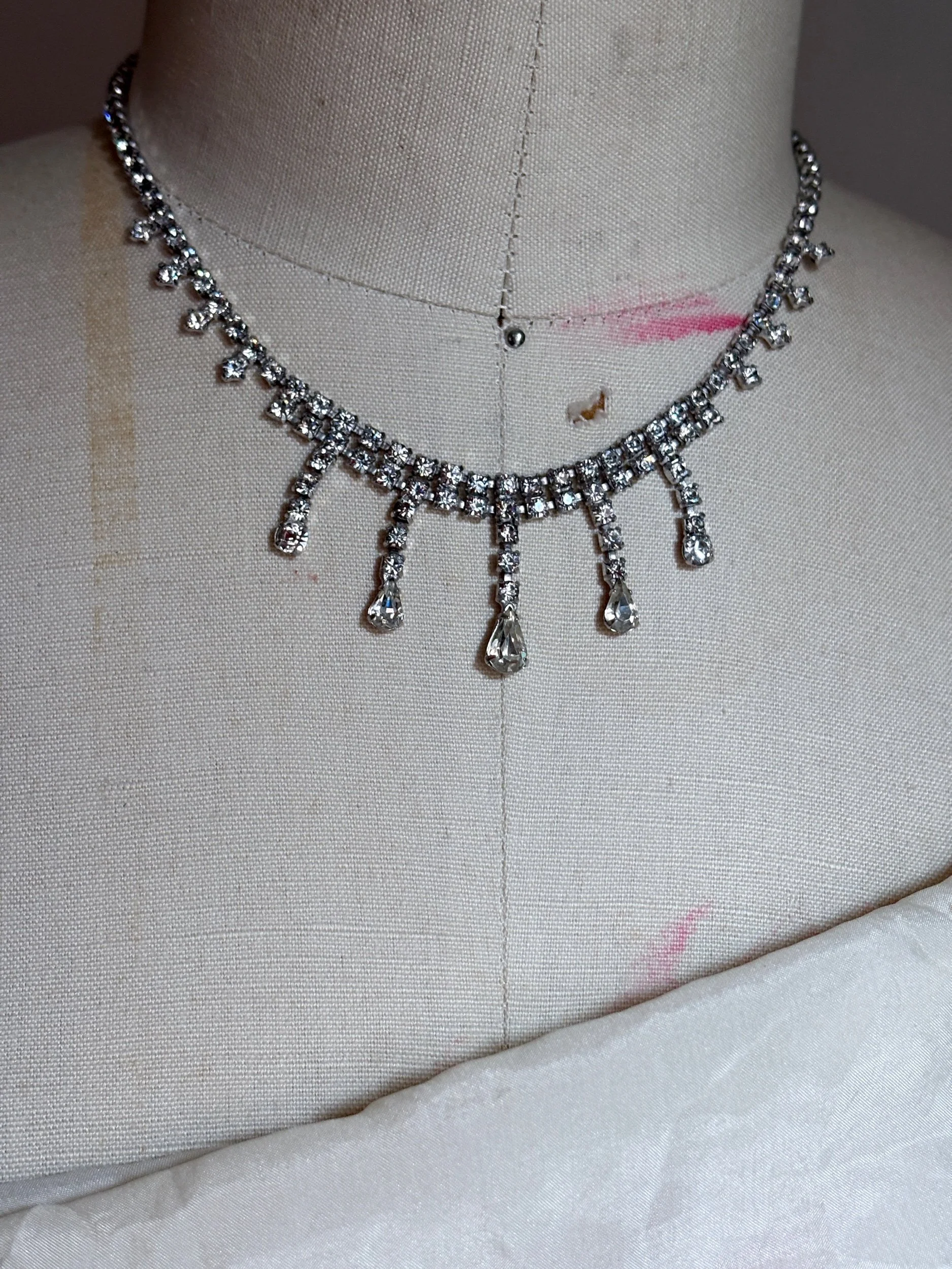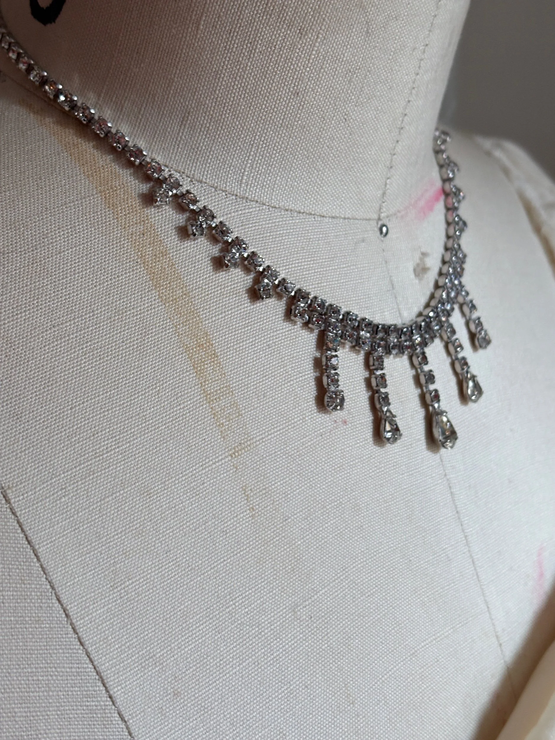A luminous line of crystal chatons finished with delicate teardrop drops—effortless sparkle that reads “old-Hollywood” with a modern edge. Sits beautifully at the collarbone and layers well with a longer chain.