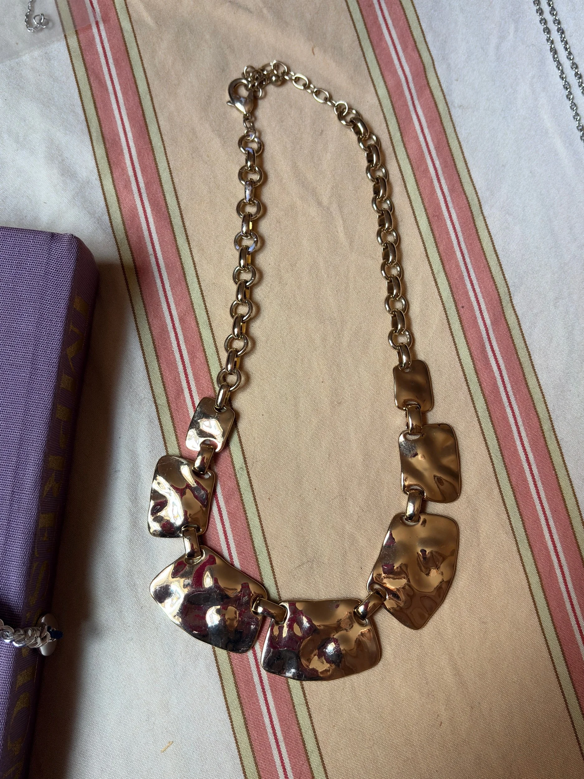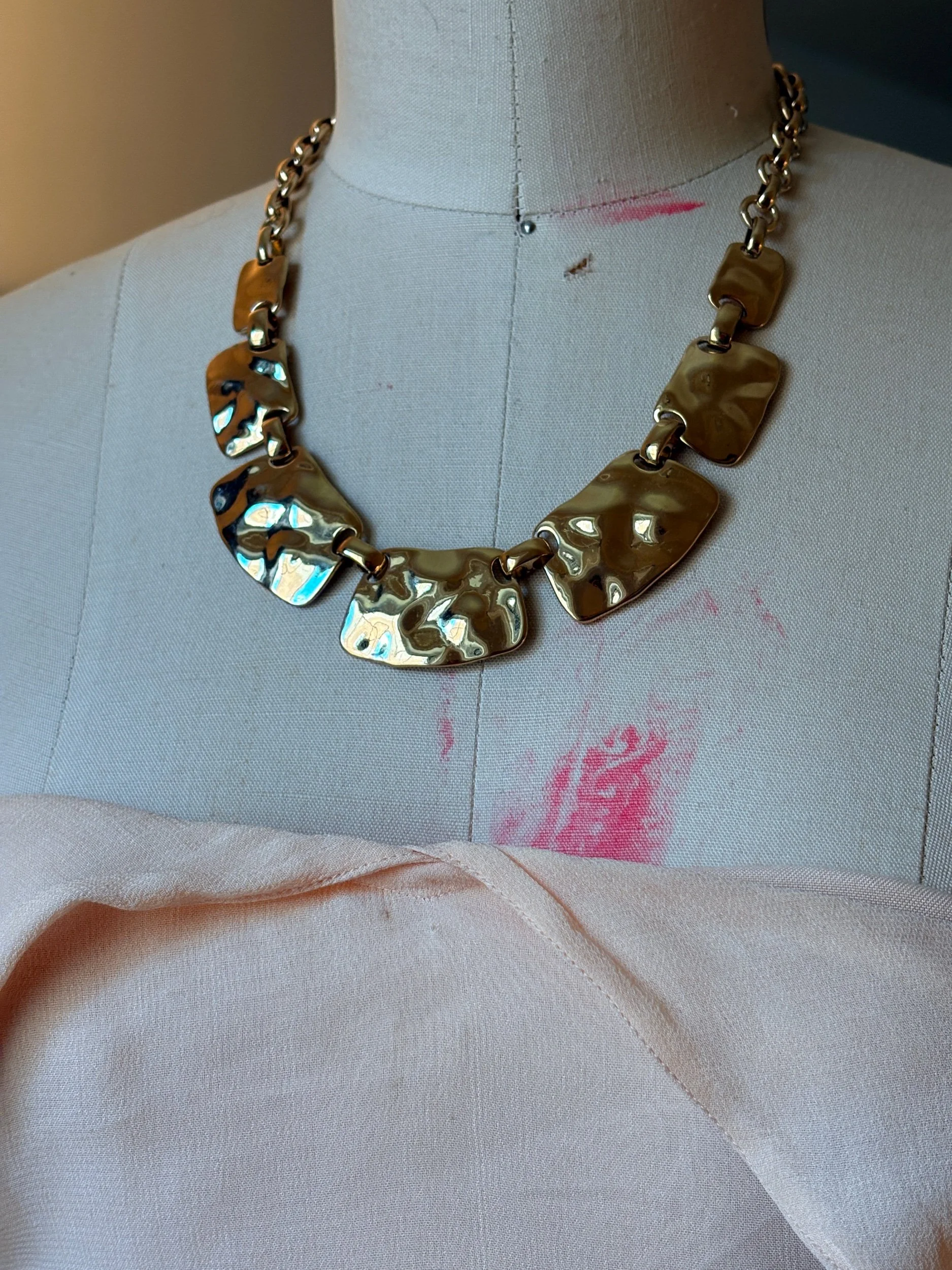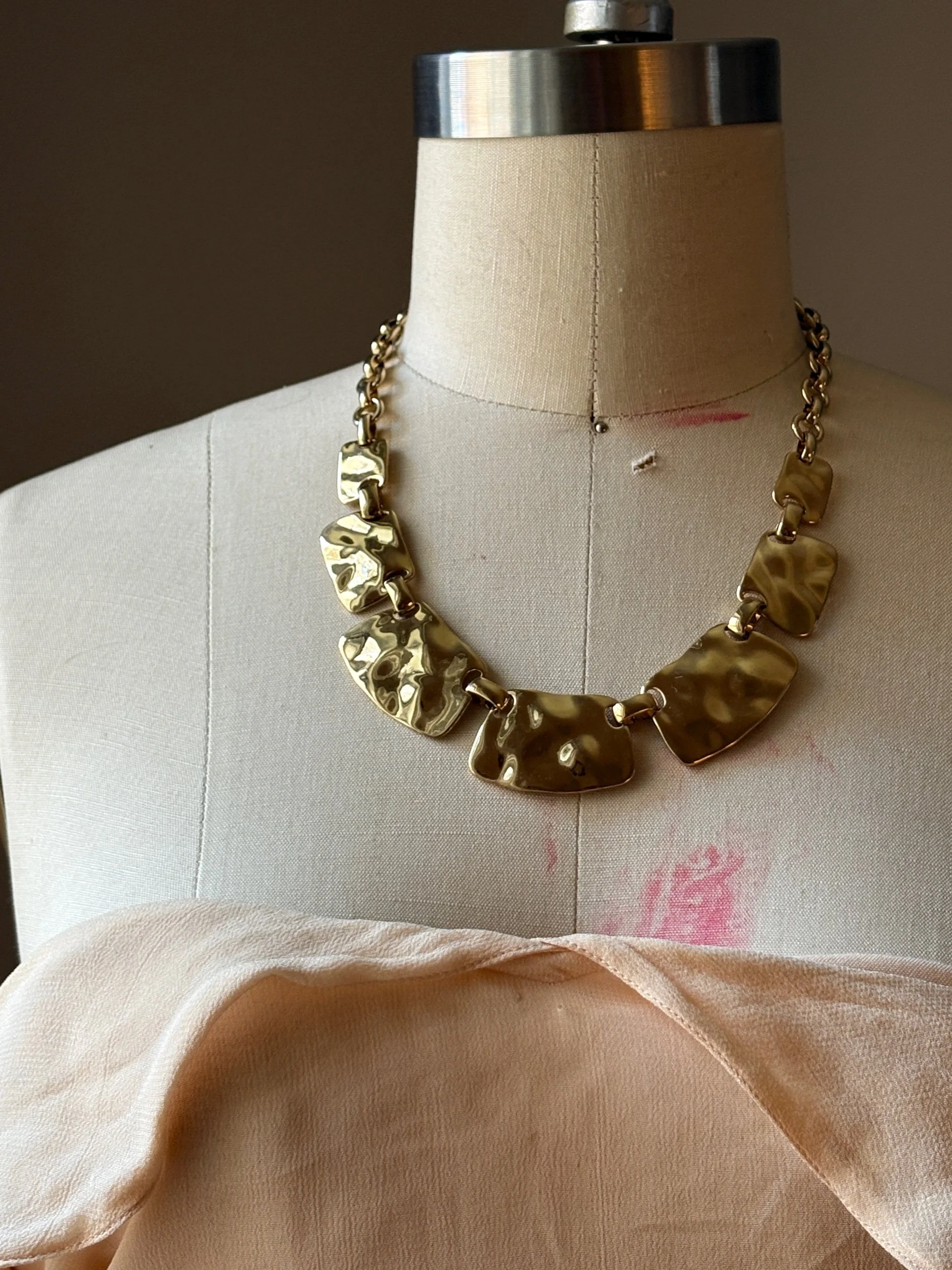 This striking necklace features sculpted, high-shine gold panels connected in a bold, flowing design. Each irregularly shaped section captures light like molten metal, symbolizing movement and modern craftsmanship. The hammered finish adds depth and texture, making it a key statement piece suitable for both minimalist and maximalist styles.