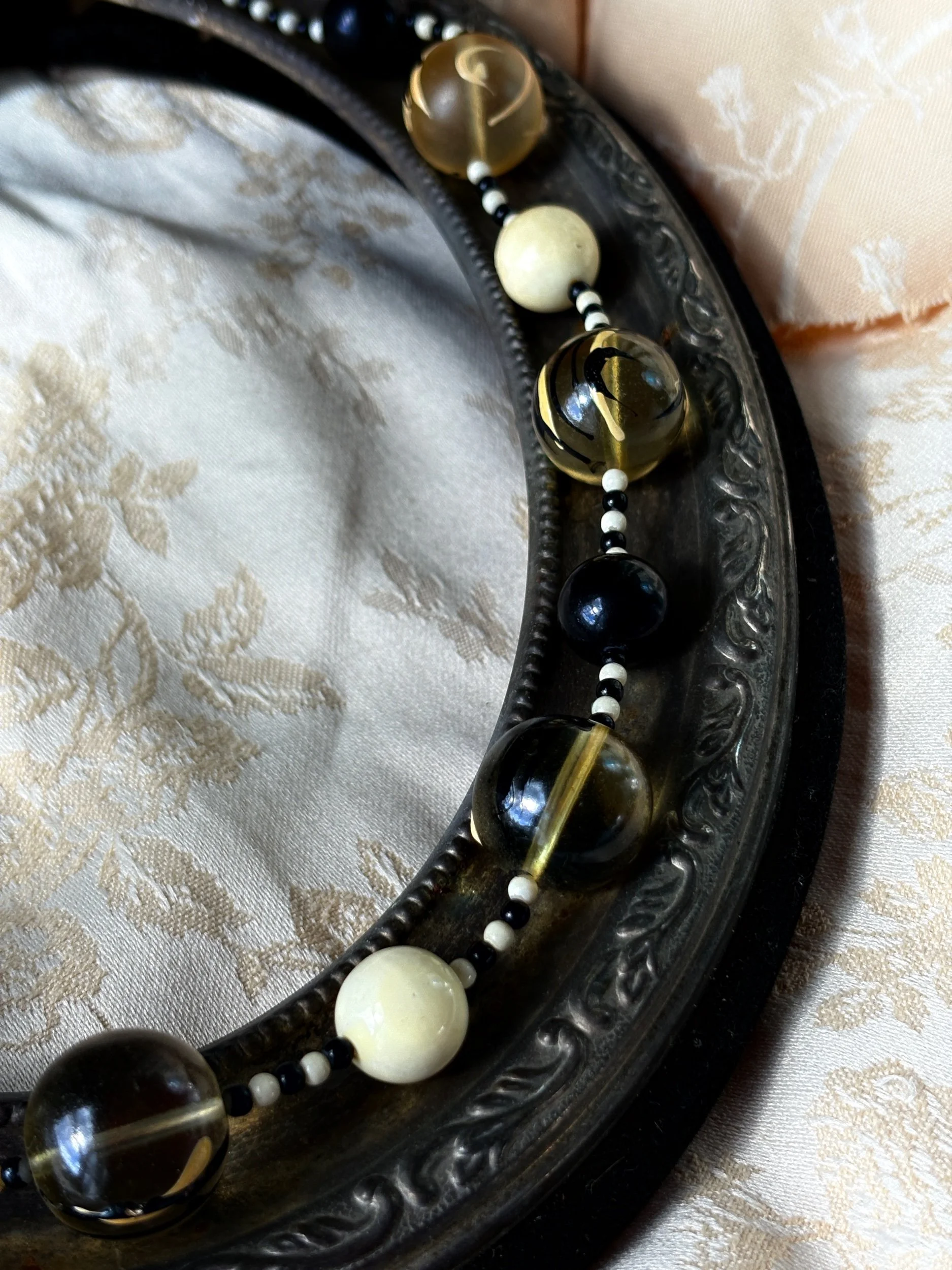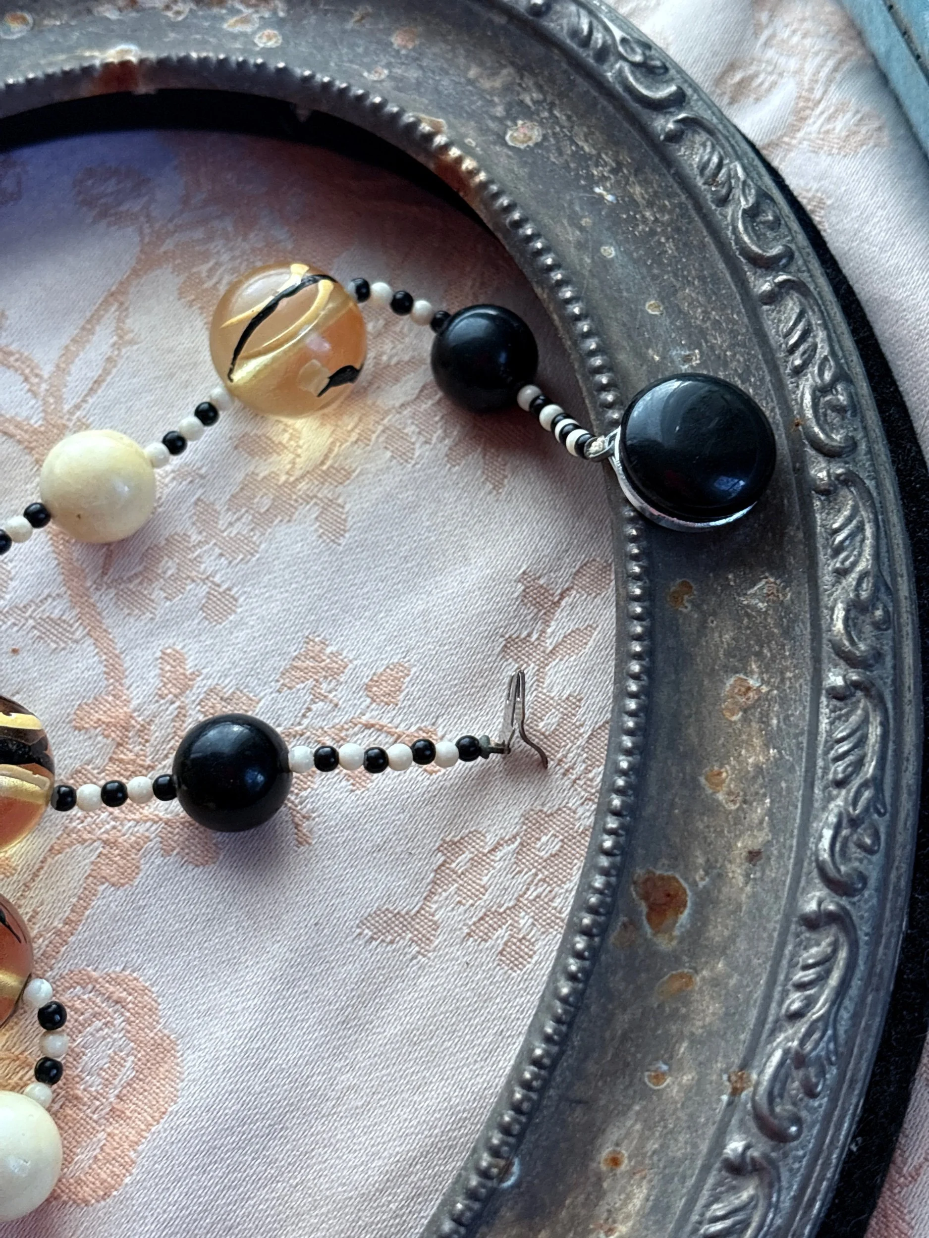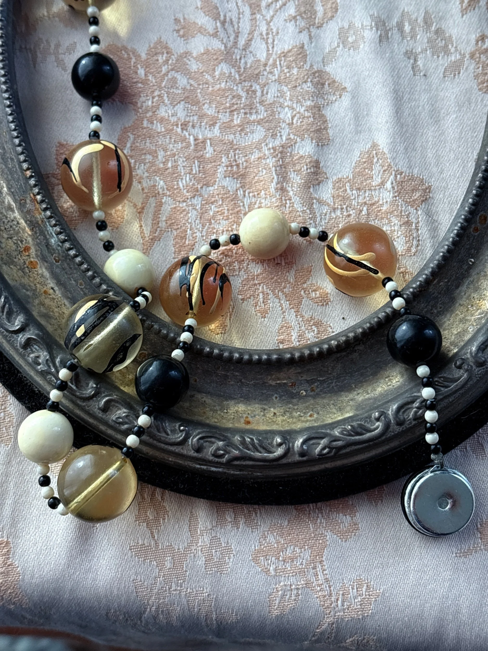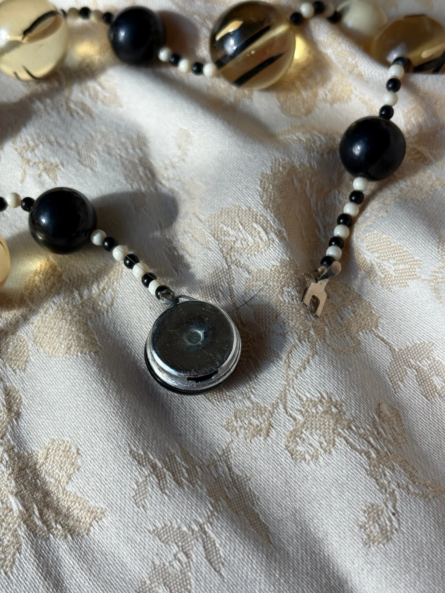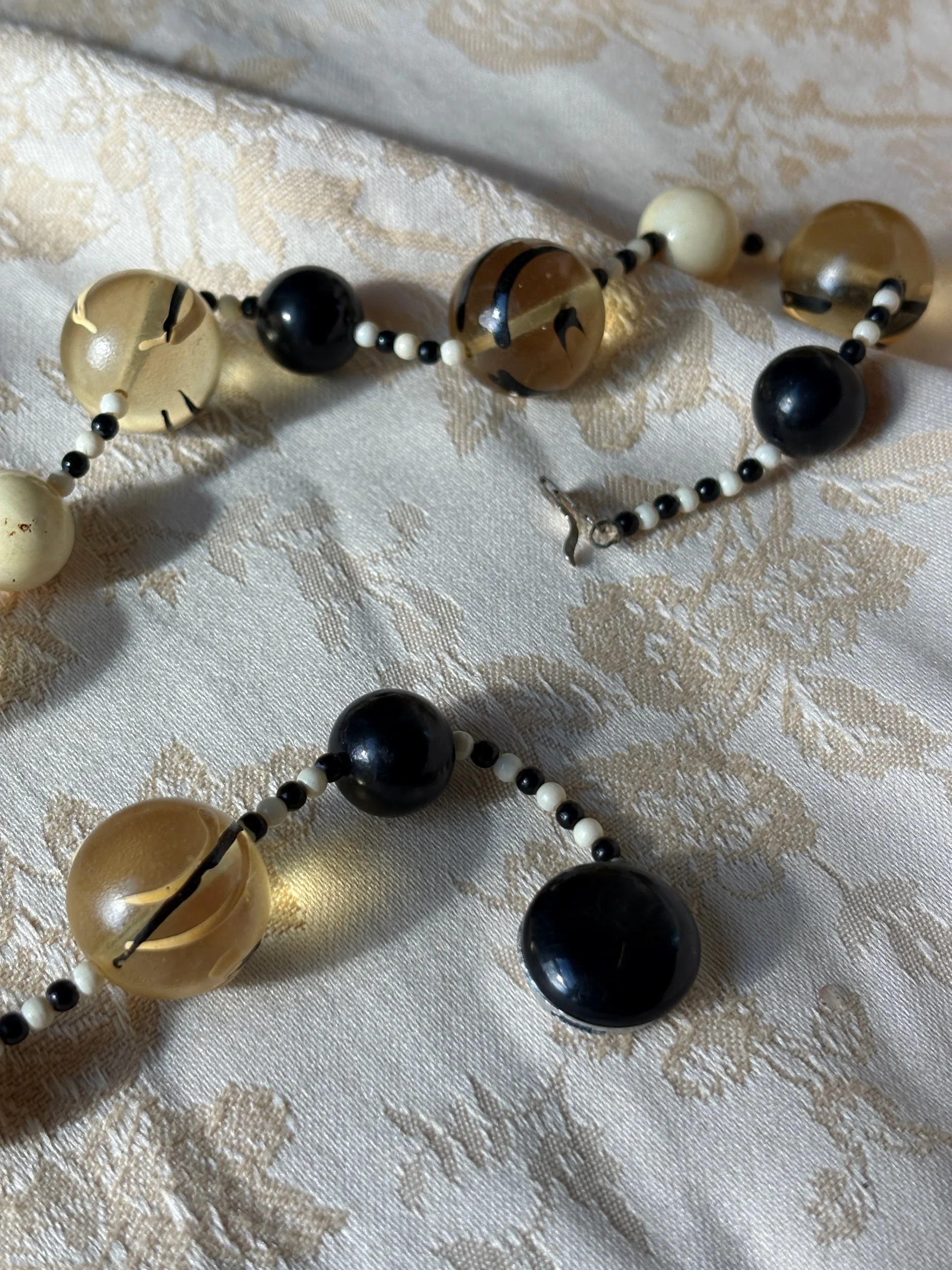 A striking vintage statement necklace in a bold black-and-ivory palette, featuring oversized domed lucite discs with floating gold-tone striping, accented by glossy black and creamy round beads. Graphic, mid-century modern energy with a very wearable, neutral color story—perfect with a simple black tee, a slip dress, or a sharp blazer.