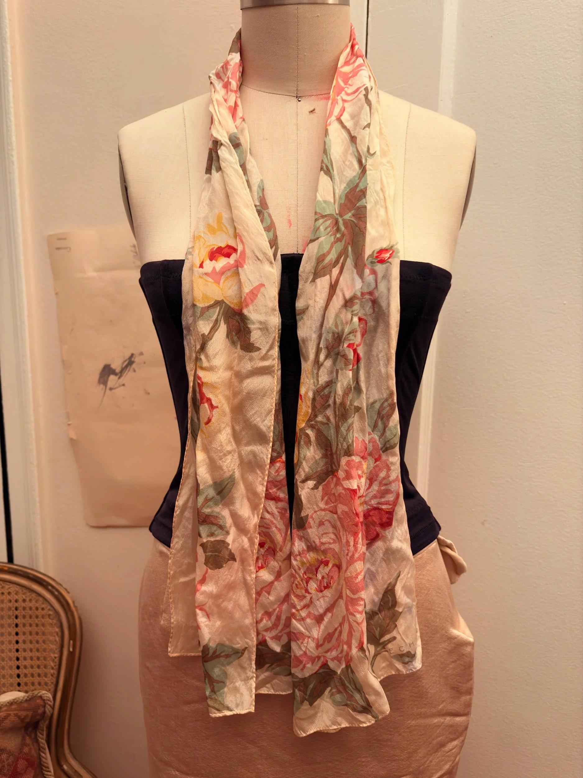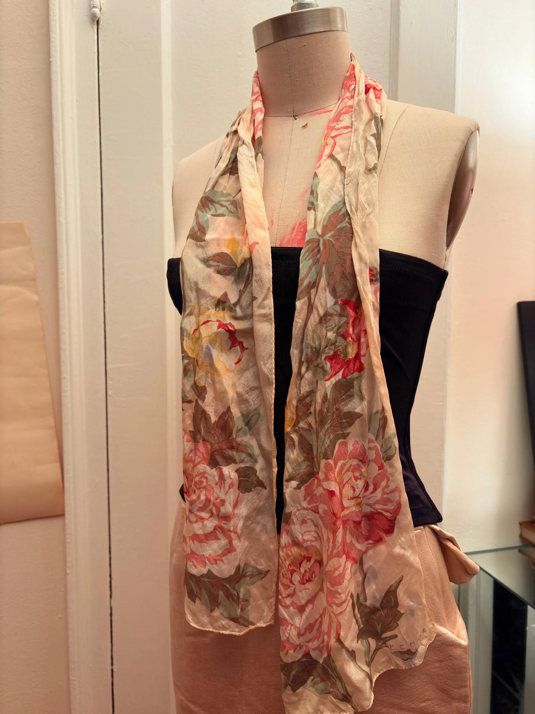 A whisper of silk and soft nostalgia, this vintage scarf blooms with hand-painted-style peonies in blush, ivory, and faded gold. The fabric is weightless and sheer, catching the light with quiet elegance. Drape it loosely over the shoulders or tie it at the neck for a romantic accent.