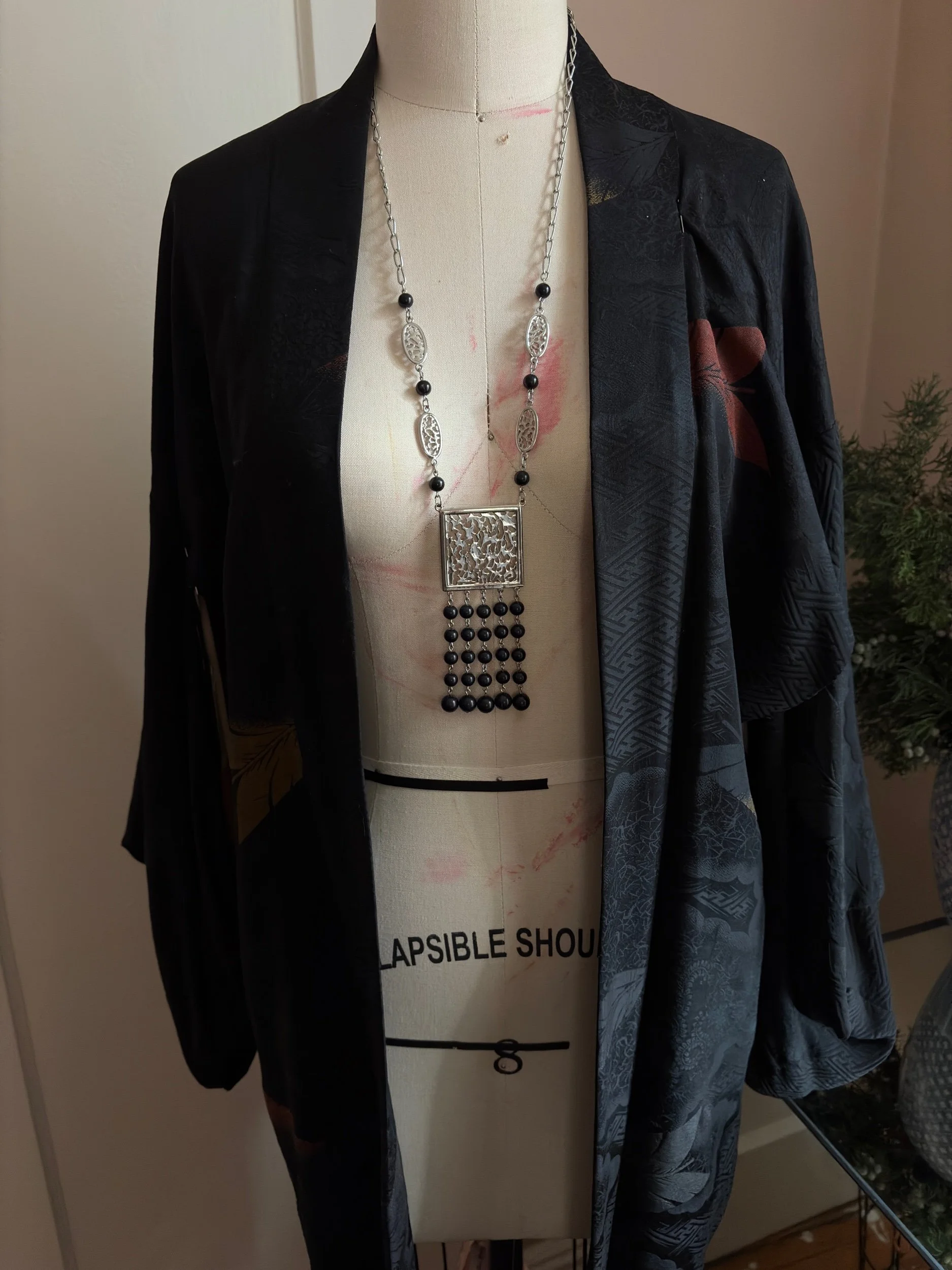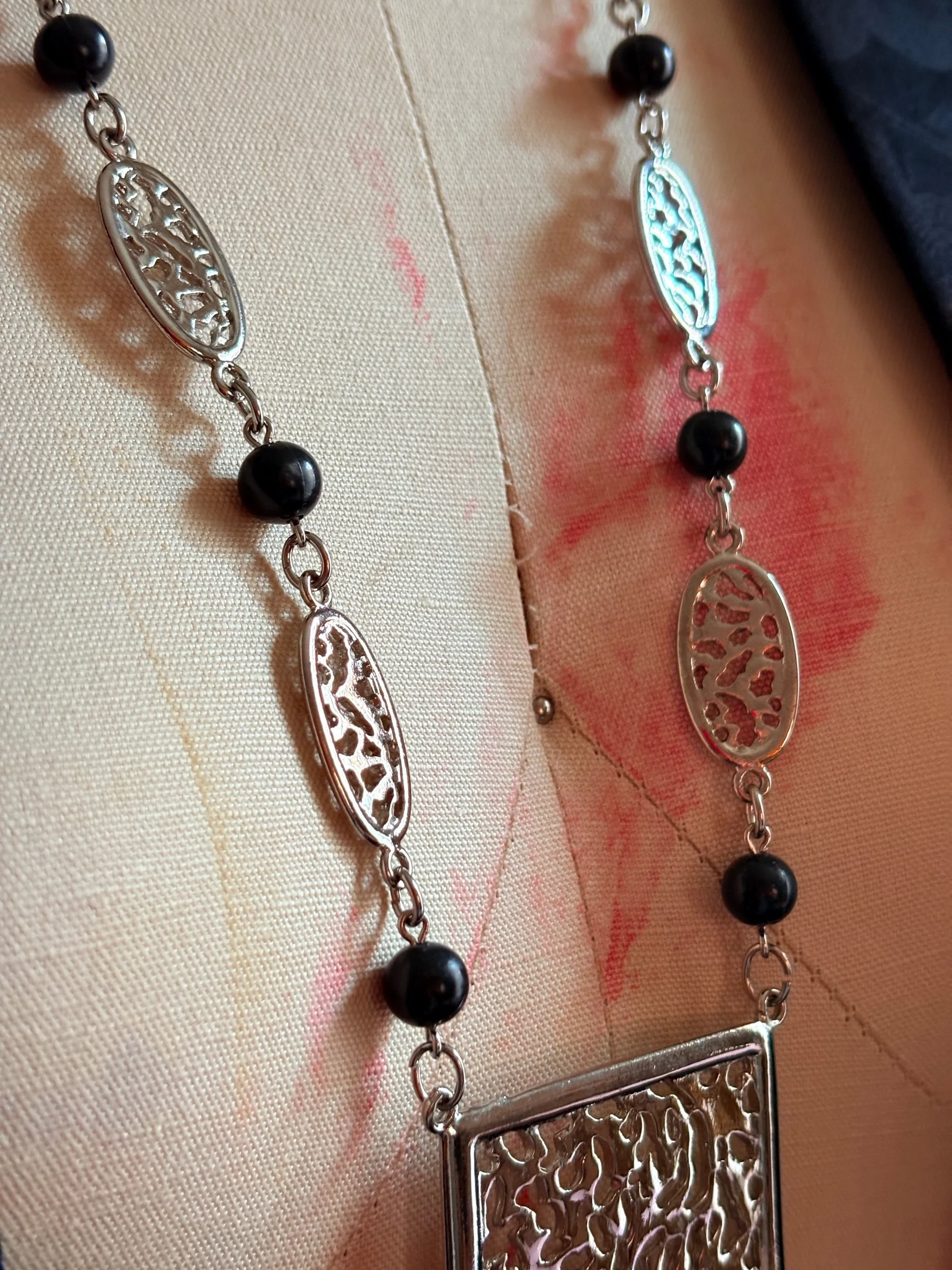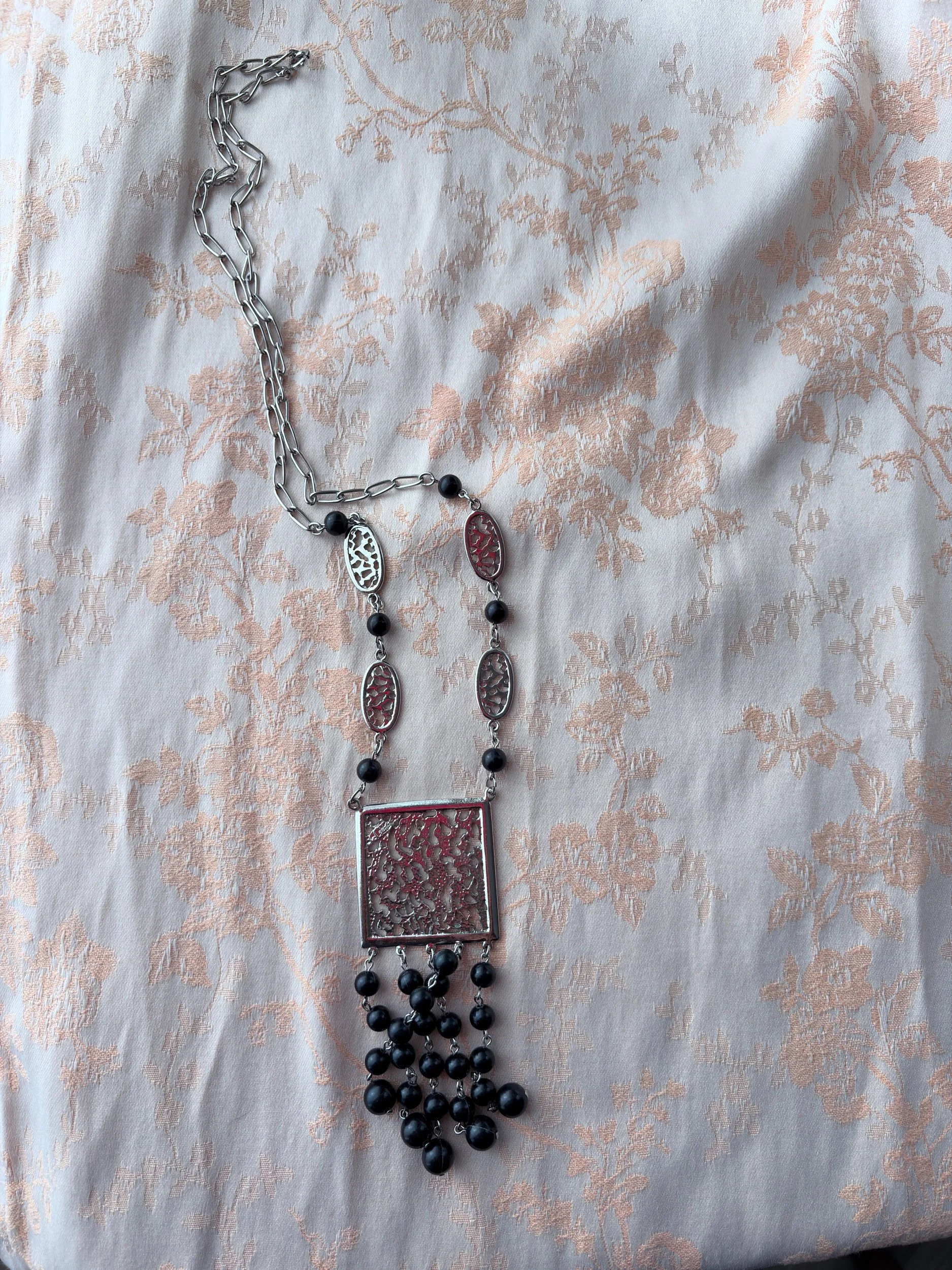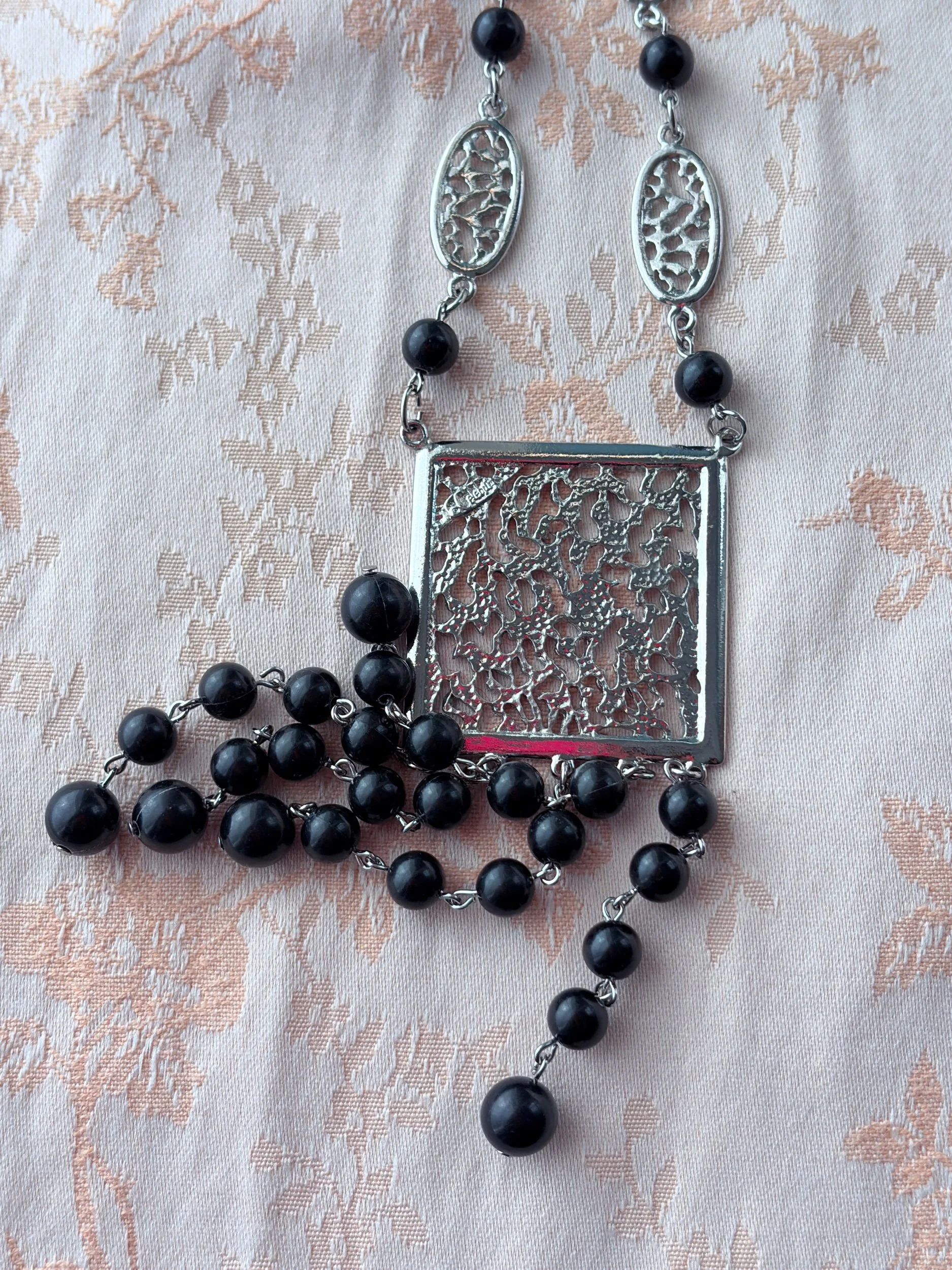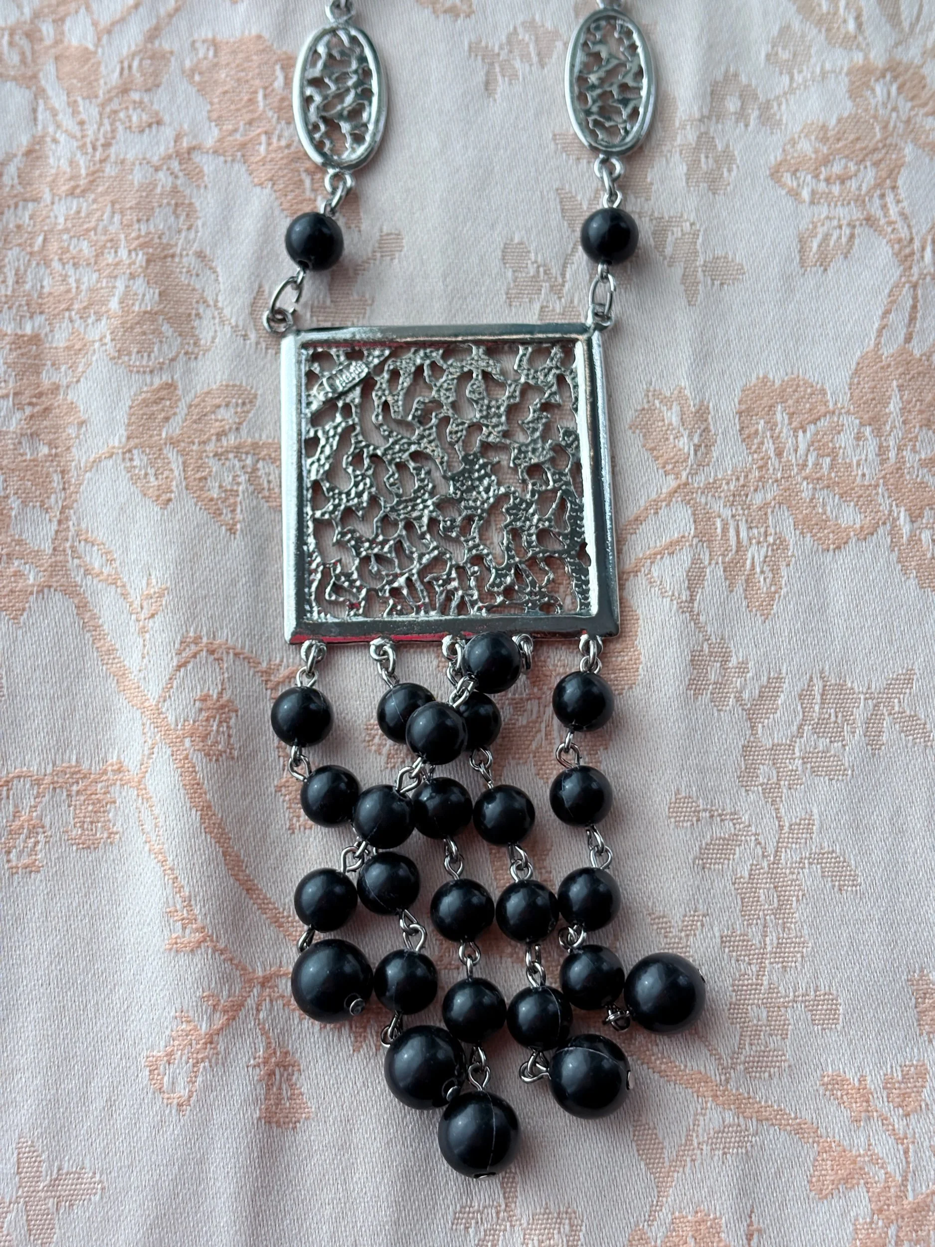 A bold, sculptural piece with a dark, graphic mood. This vintage necklace pairs a large silver-tone openwork square pendant with cascading black bead fringe and oval link stations along the chain. It moves beautifully when worn and sits as a true statement piece—perfect with a simple black dress or a worn-in tee and blazer.