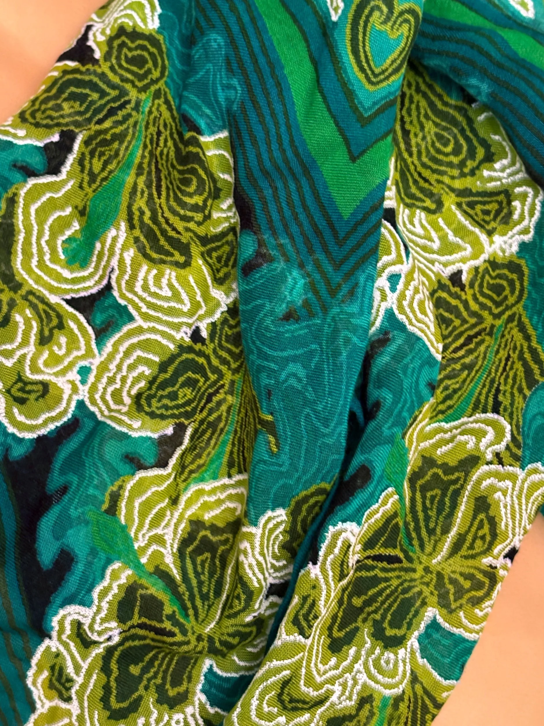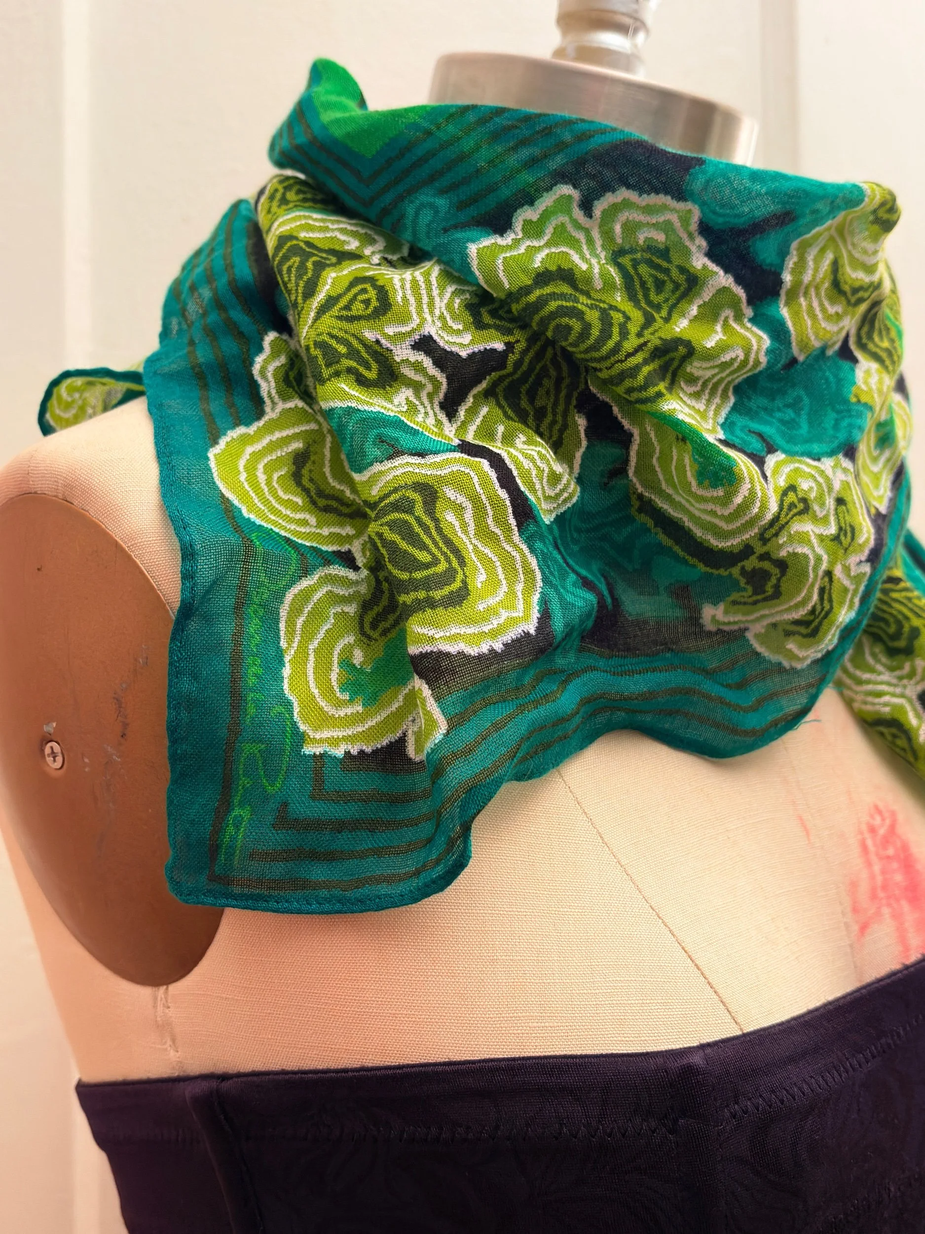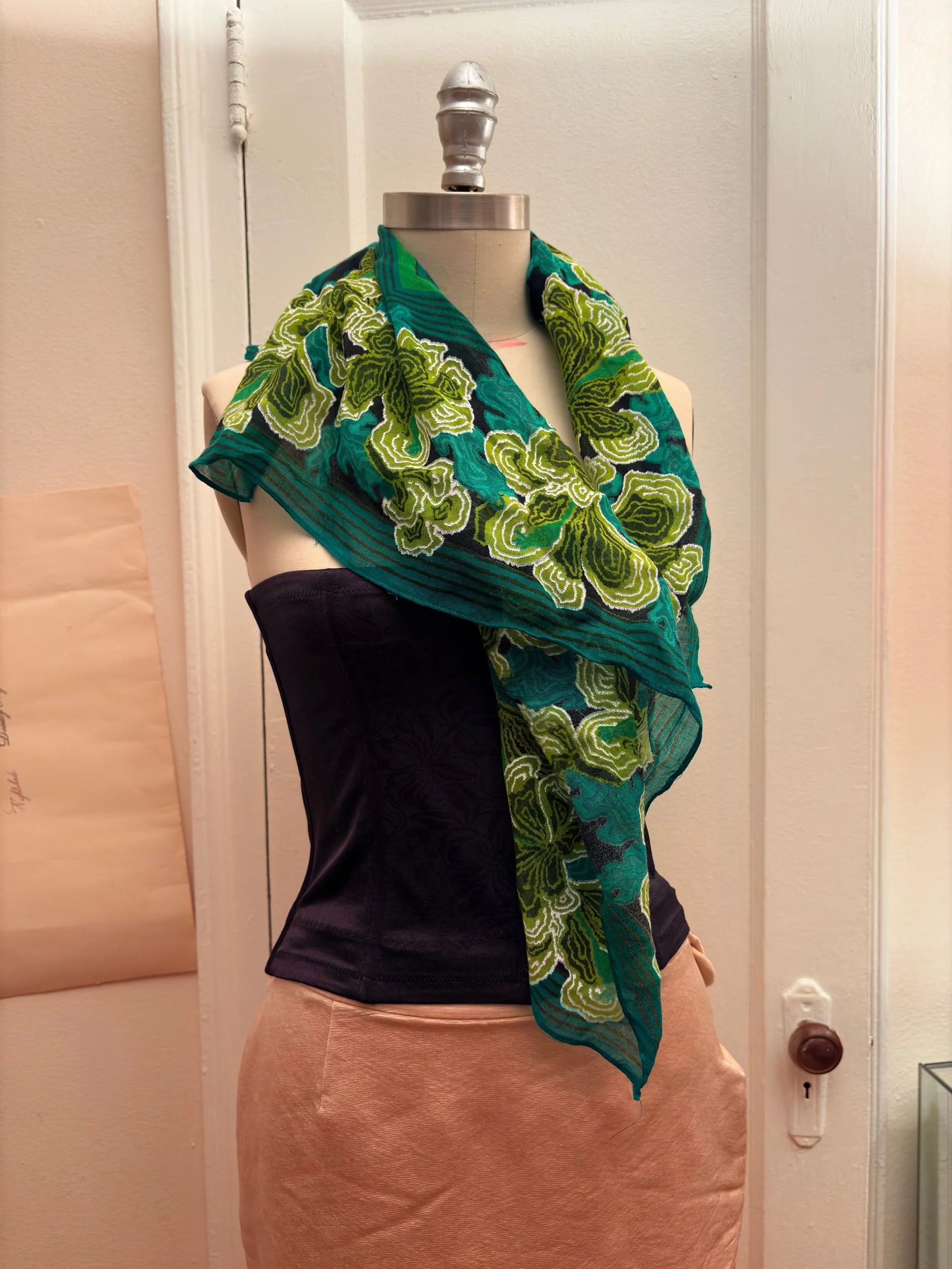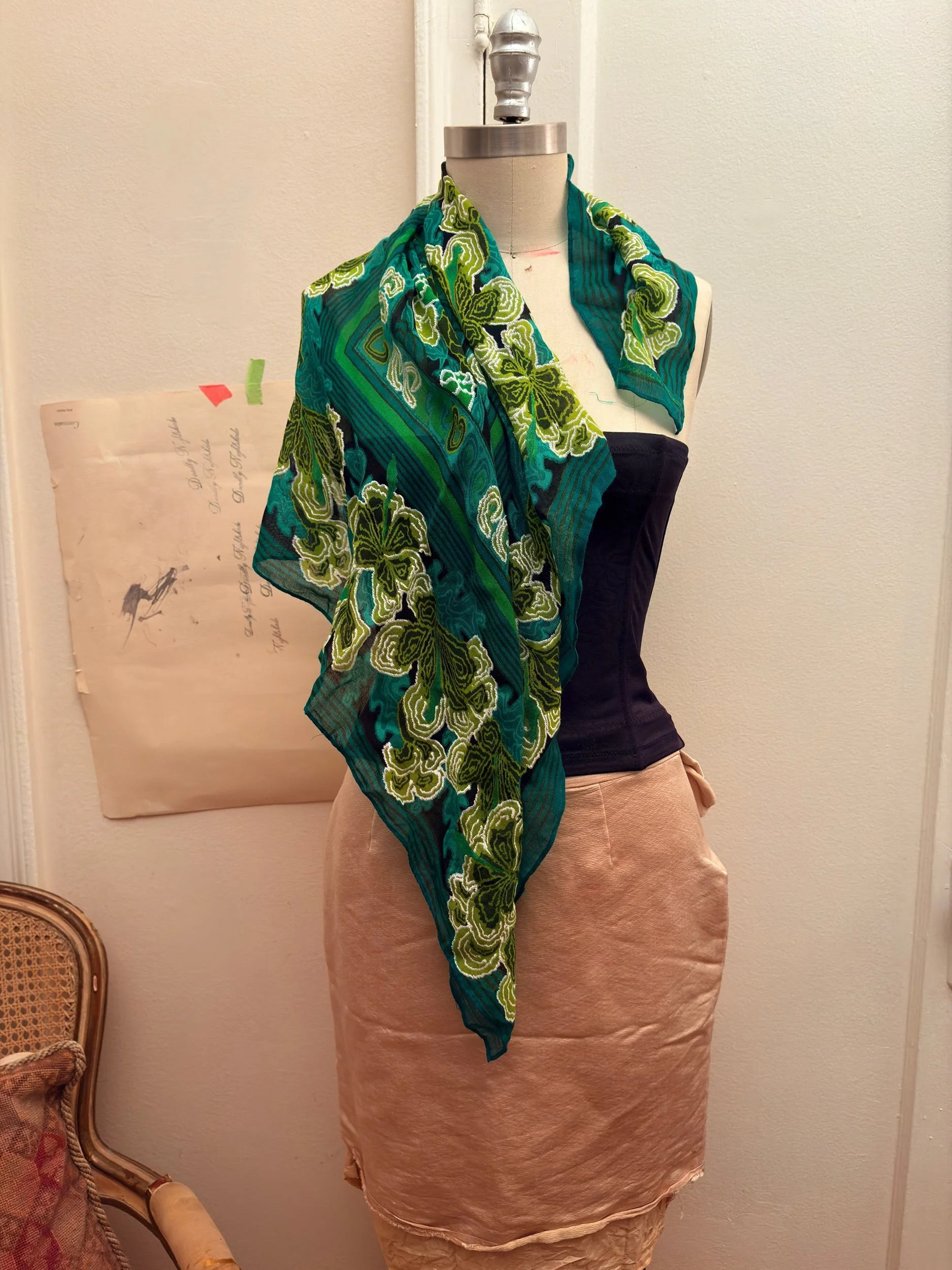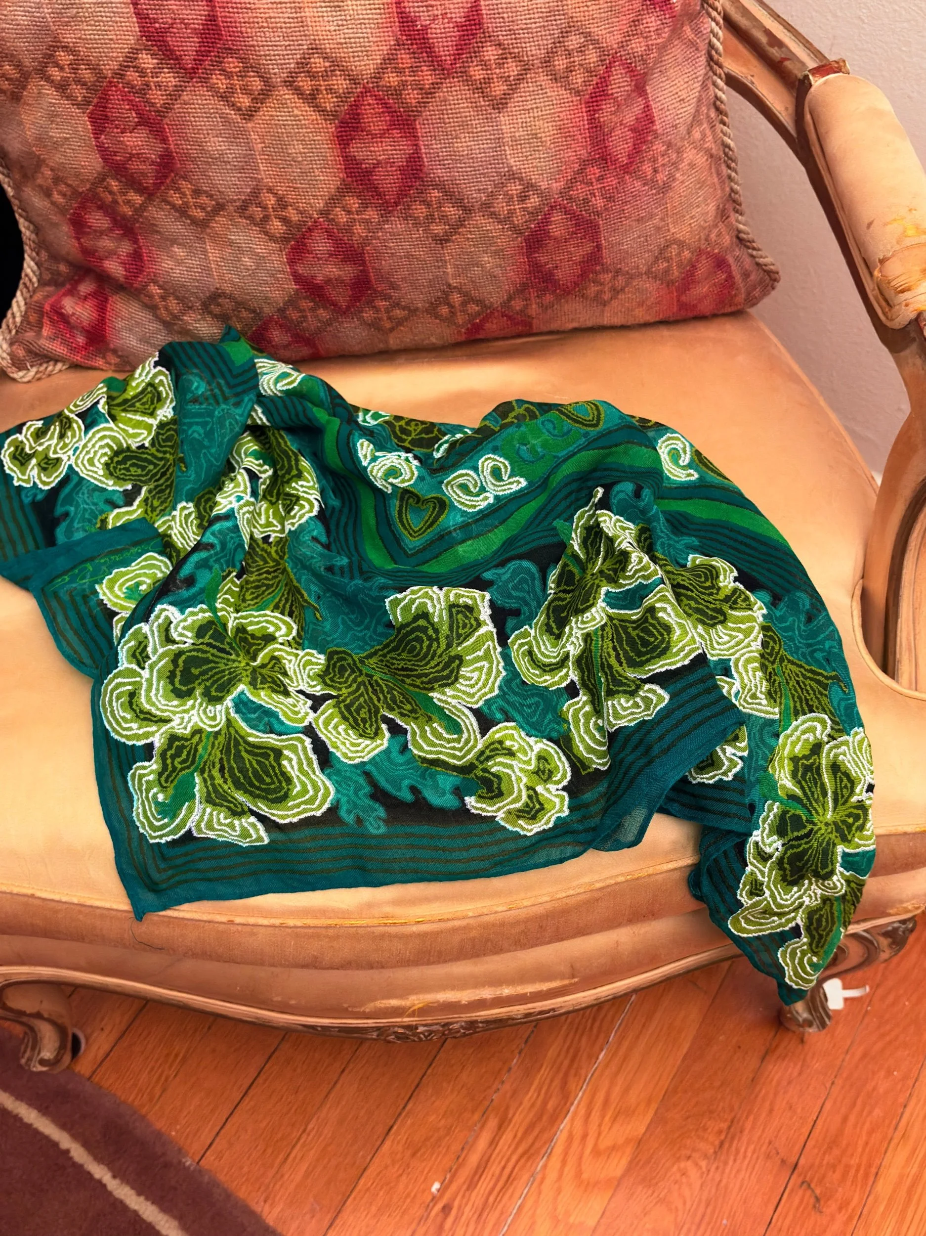 A lush, collectible silk scarf by Oscar de la Renta, printed with painterly emerald and jade blossoms that seem to bloom from deep teal silk. The hand-rolled edges and signature logo add refinement, while the soft patina of time gives it character and authenticity.