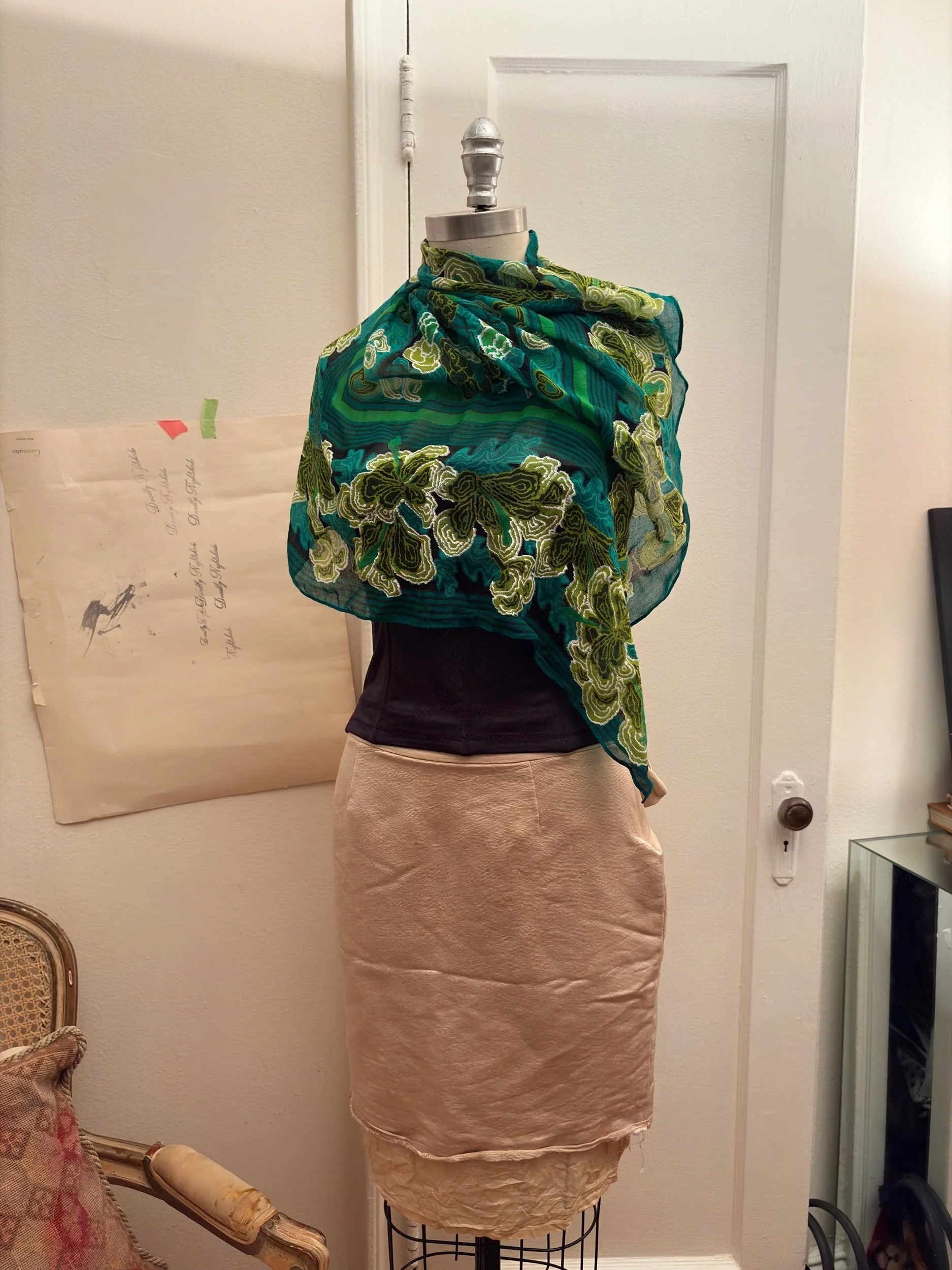 Style it knotted at the throat, draped over bare shoulders, or tied to your favorite bag—each way a quiet statement of old-world glamour.