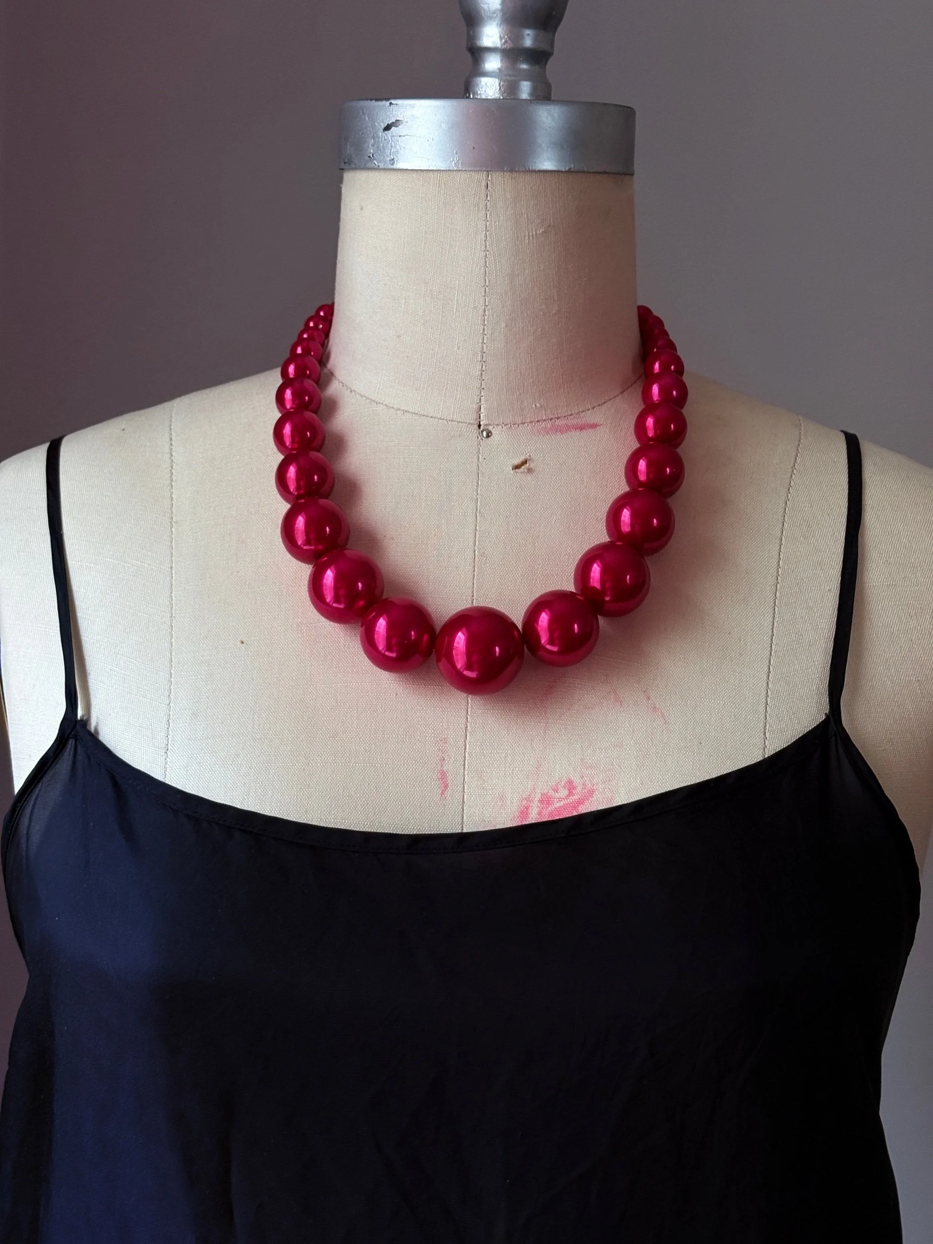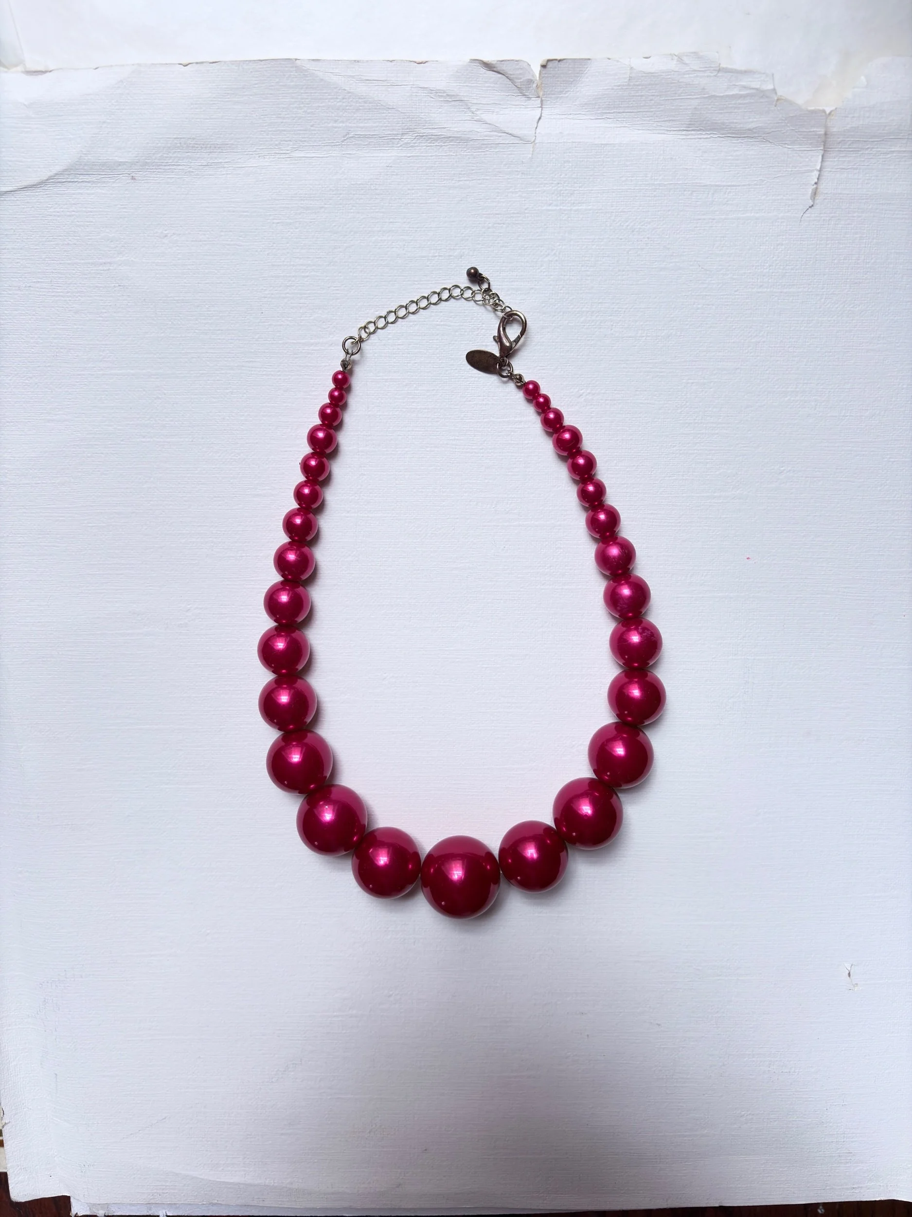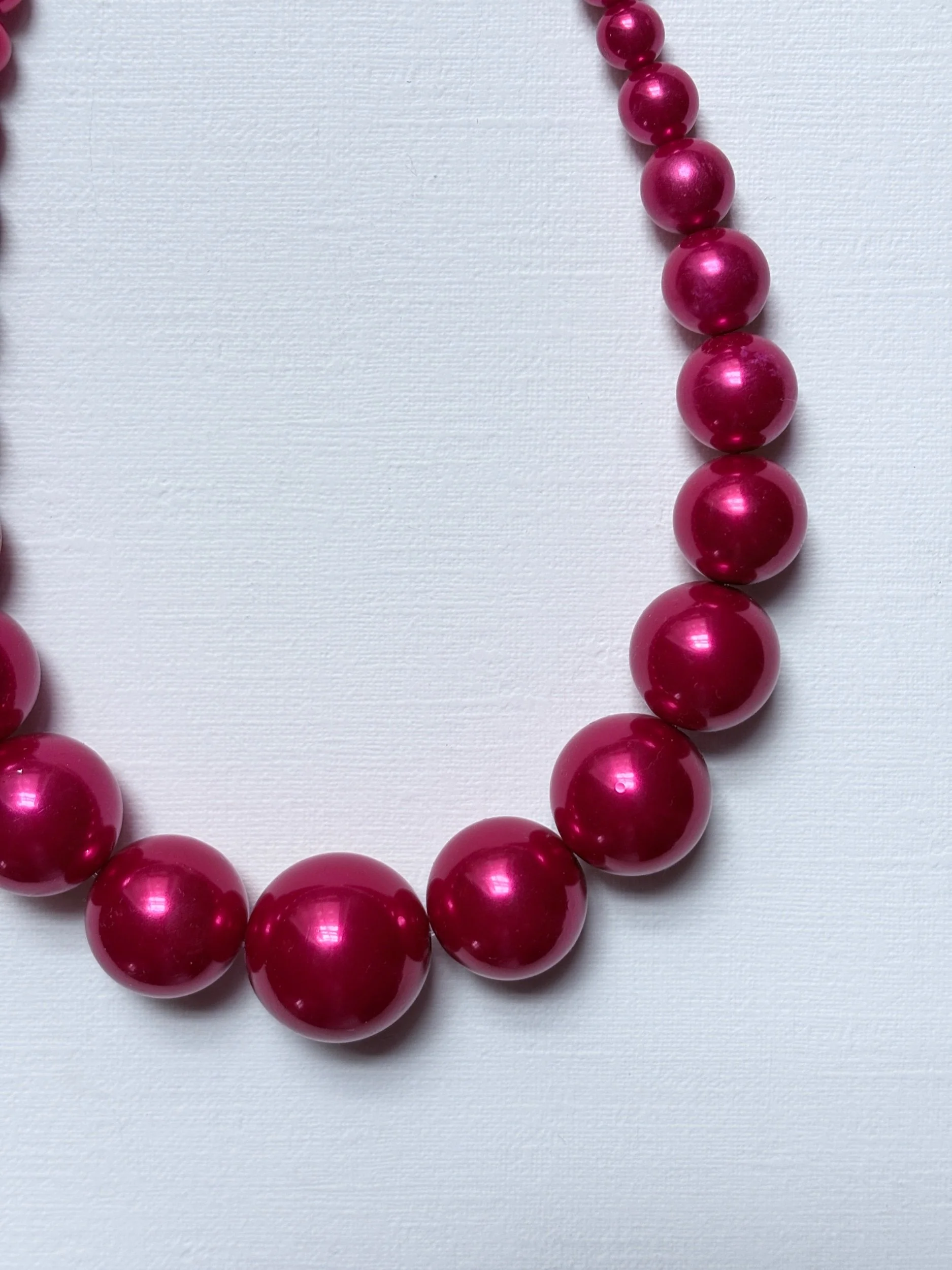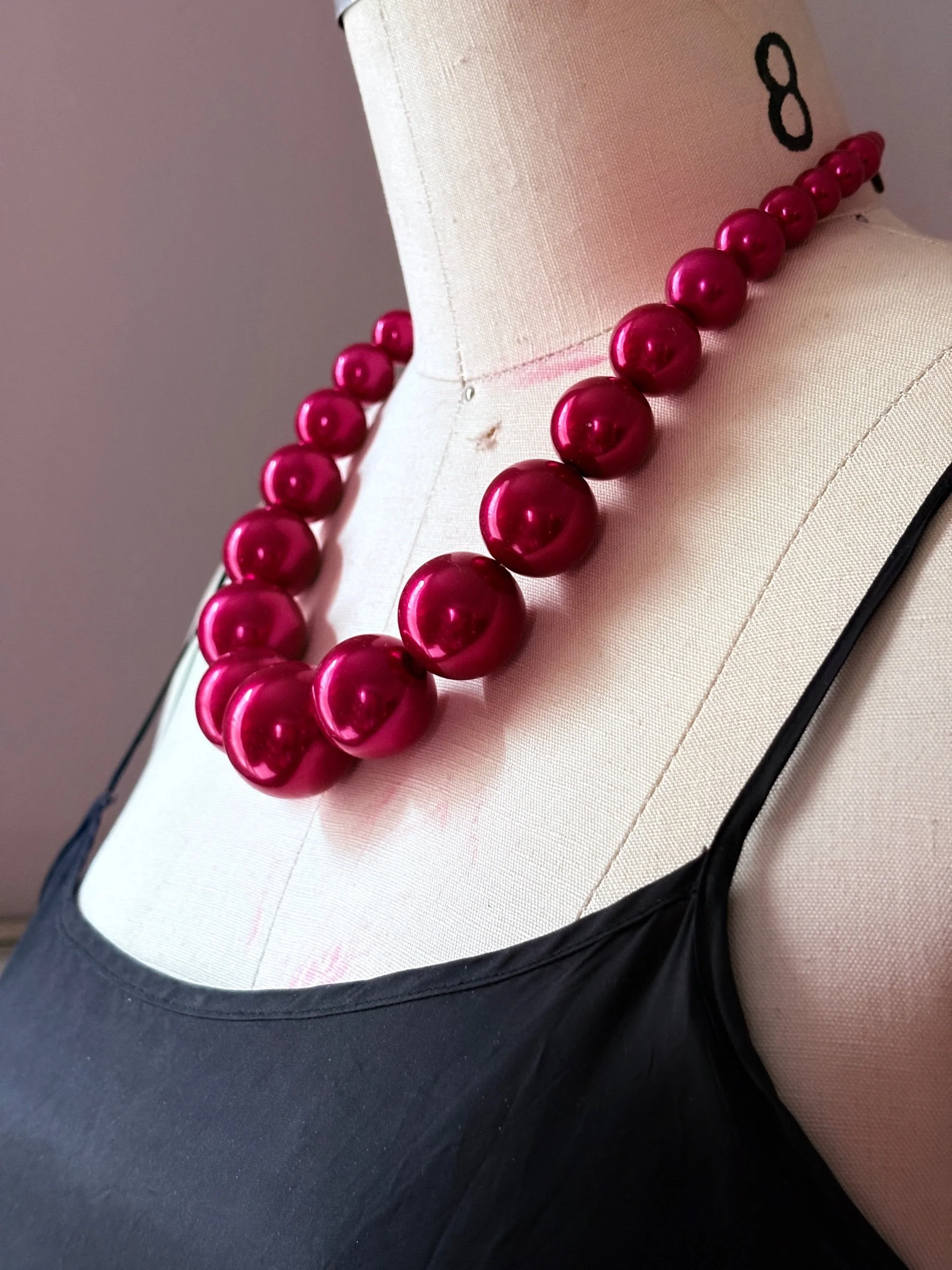 A vivid, high-gloss necklace composed of oversized graduated round beads in a saturated fuchsia tone. The silhouette is clean and graphic, with the scale of the beads giving the piece a sculptural, almost pop-art quality. It has that unmistakable statement presence: playful, polished, and bold, yet still streamlined enough to sit beautifully against black silk, crisp shirting, or a simple evening dress.