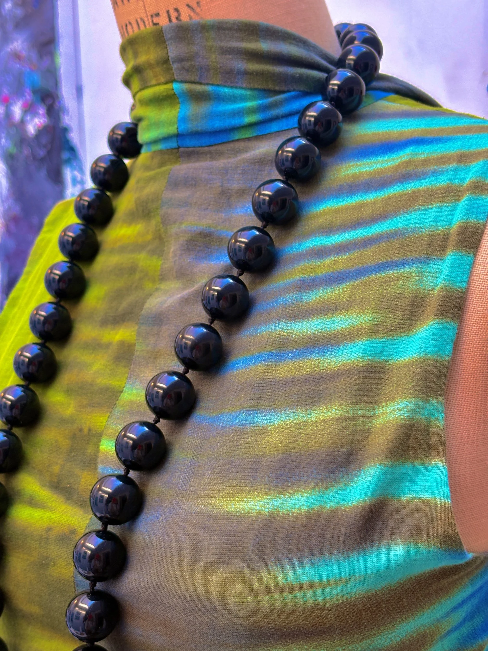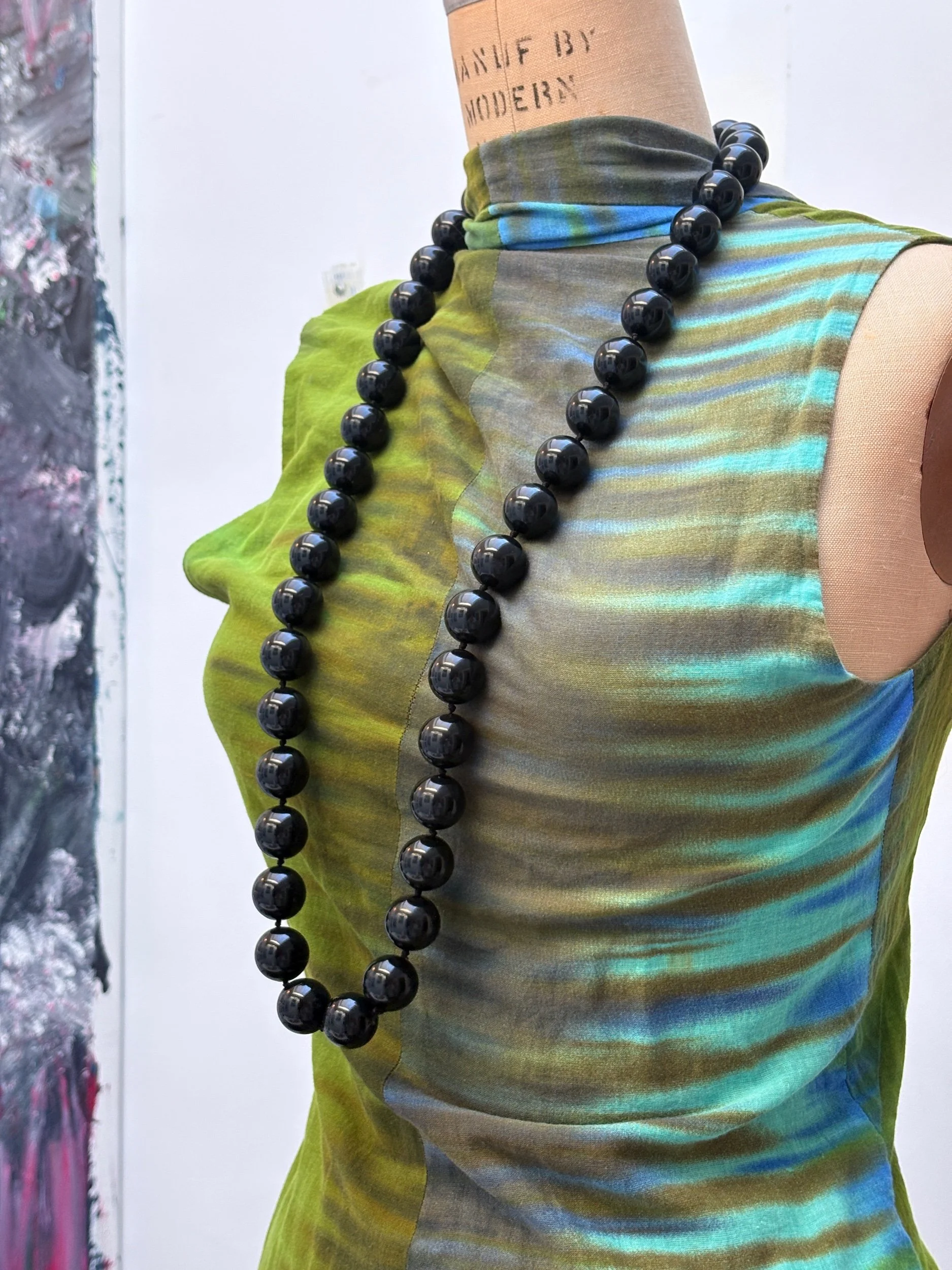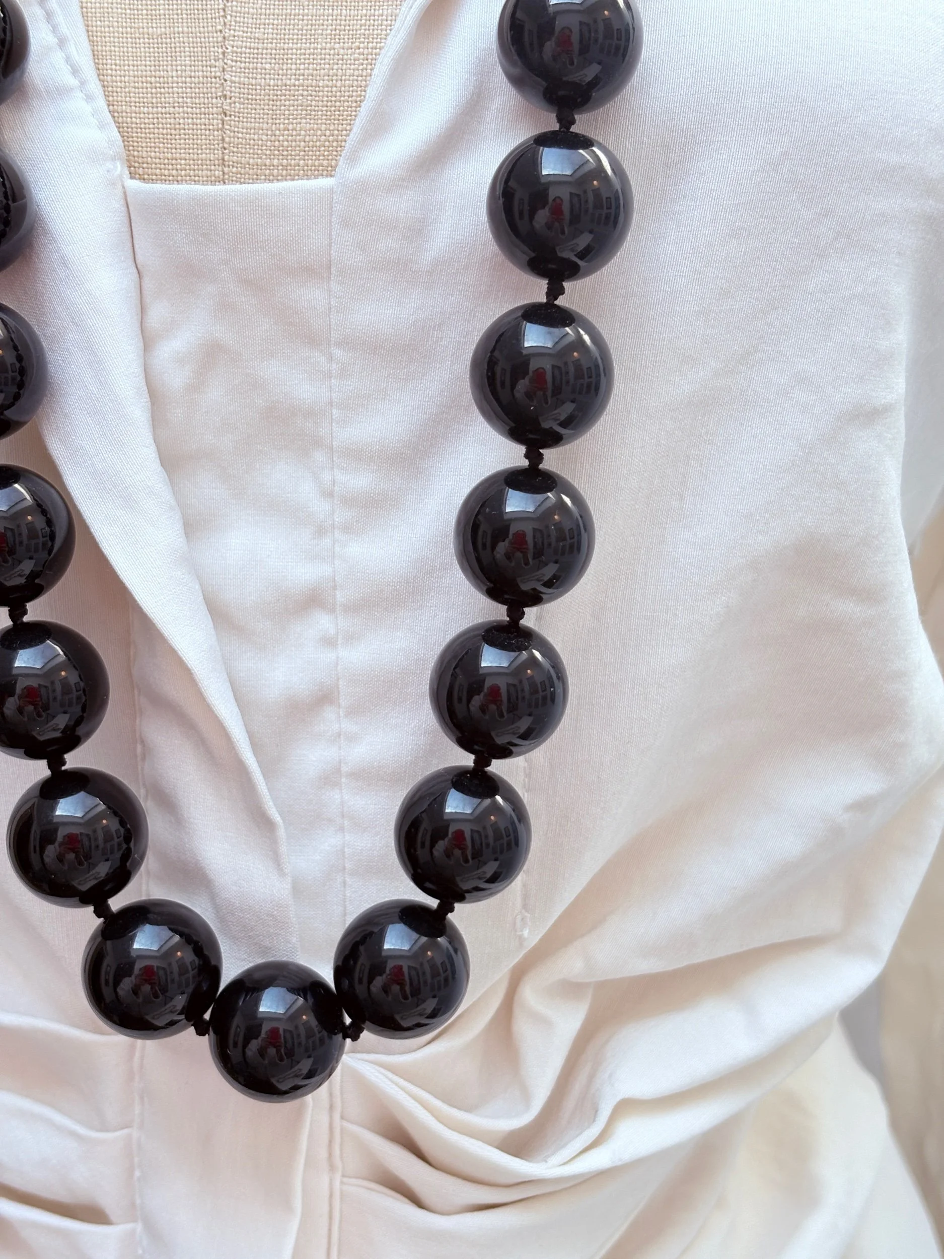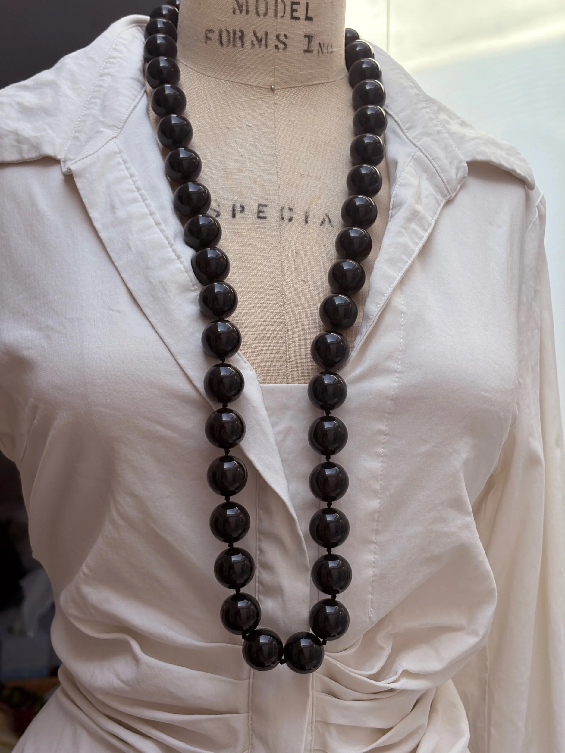 A dramatic opera-length strand composed of oversized glossy black beads, selected for its sculptural clarity and strong visual presence. The generous scale and deep reflective finish give the piece a polished, graphic quality that reads as both classic and boldly modern. Striking worn alone and equally effective layered into a more directional composition.DetailsVintage oversized black bead necklaceGlossy polished finishOpera-length silhouetteRounded bead form with substantial scaleDeep black tone with strong reflective surfaceReads as sculptural, graphic, and versatileVintage condition consistent with age and use