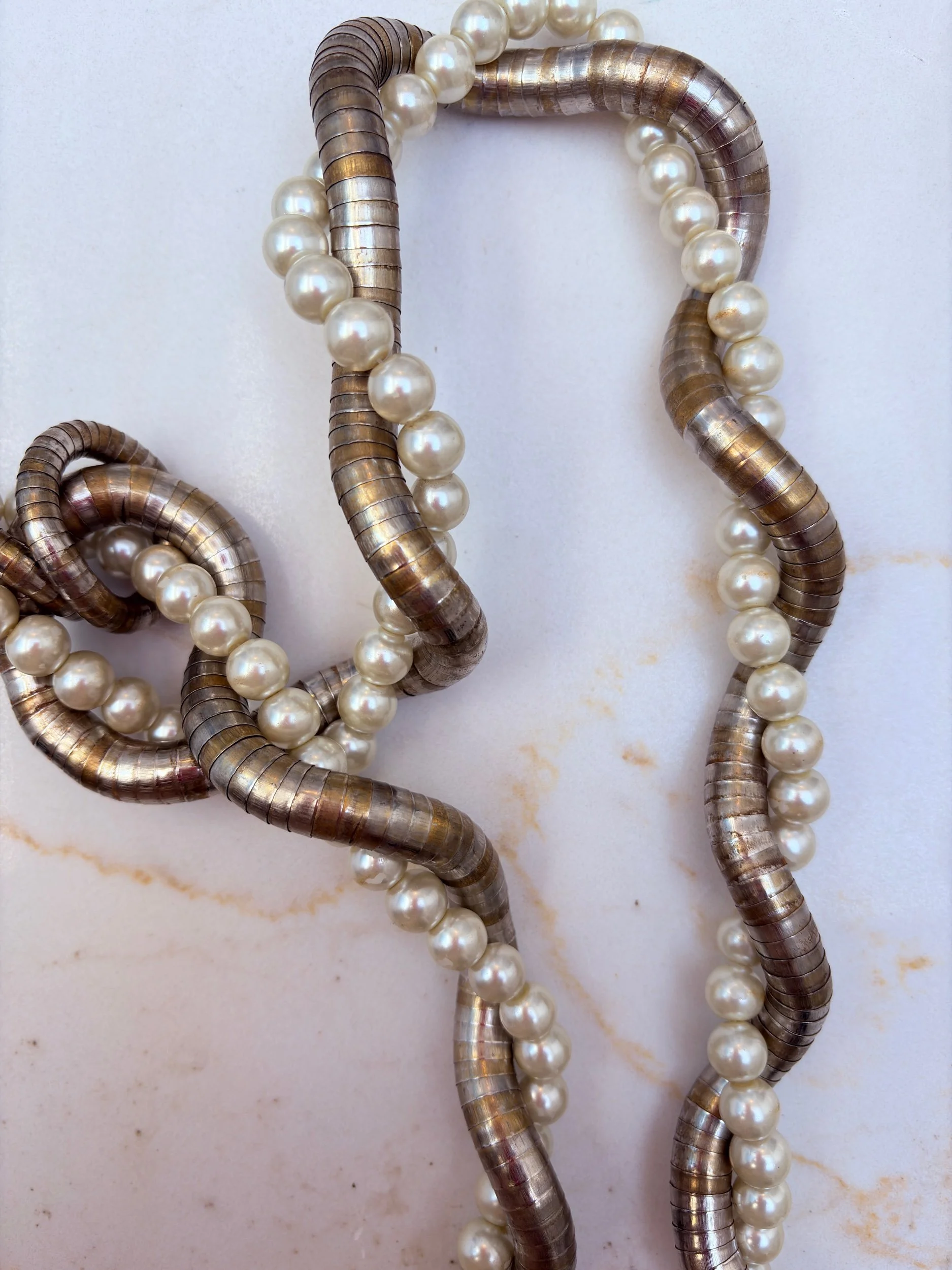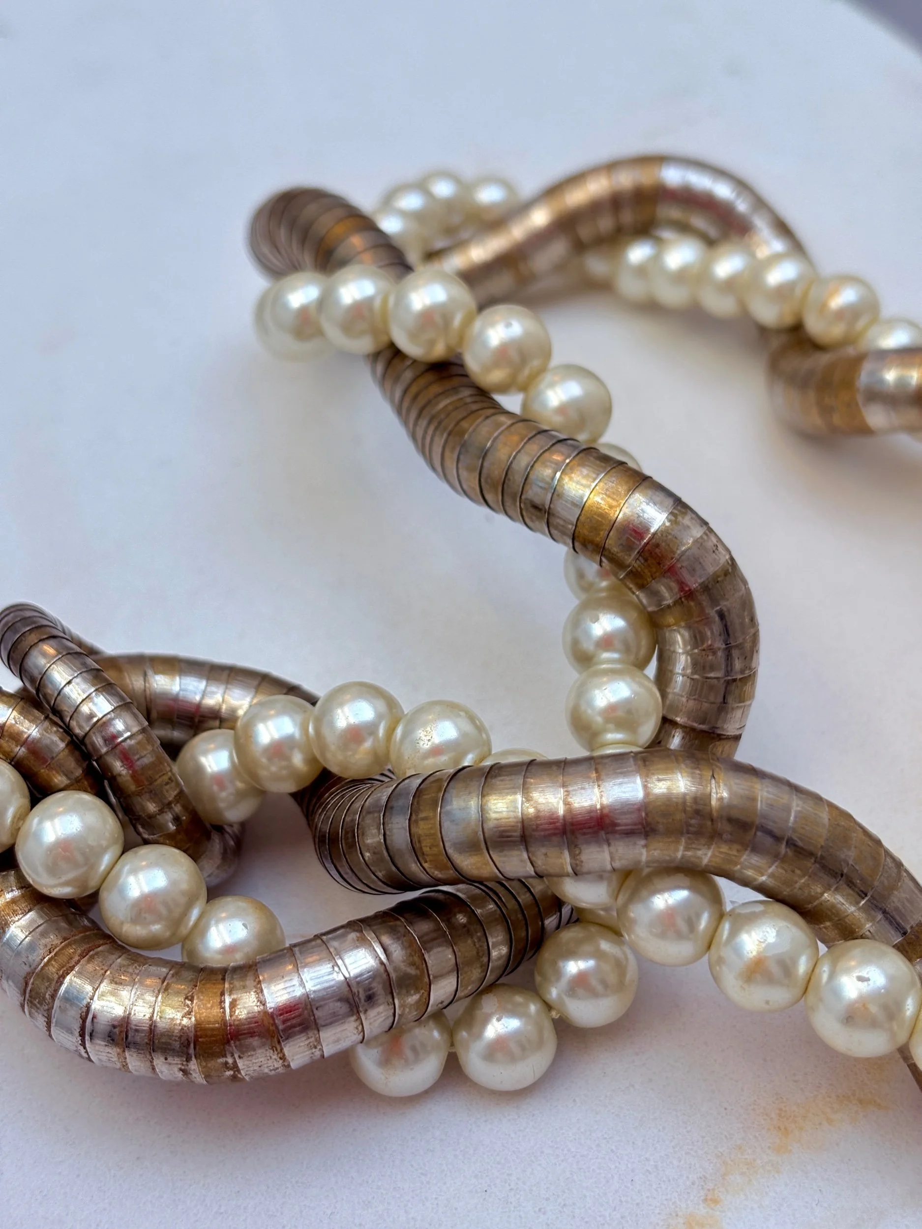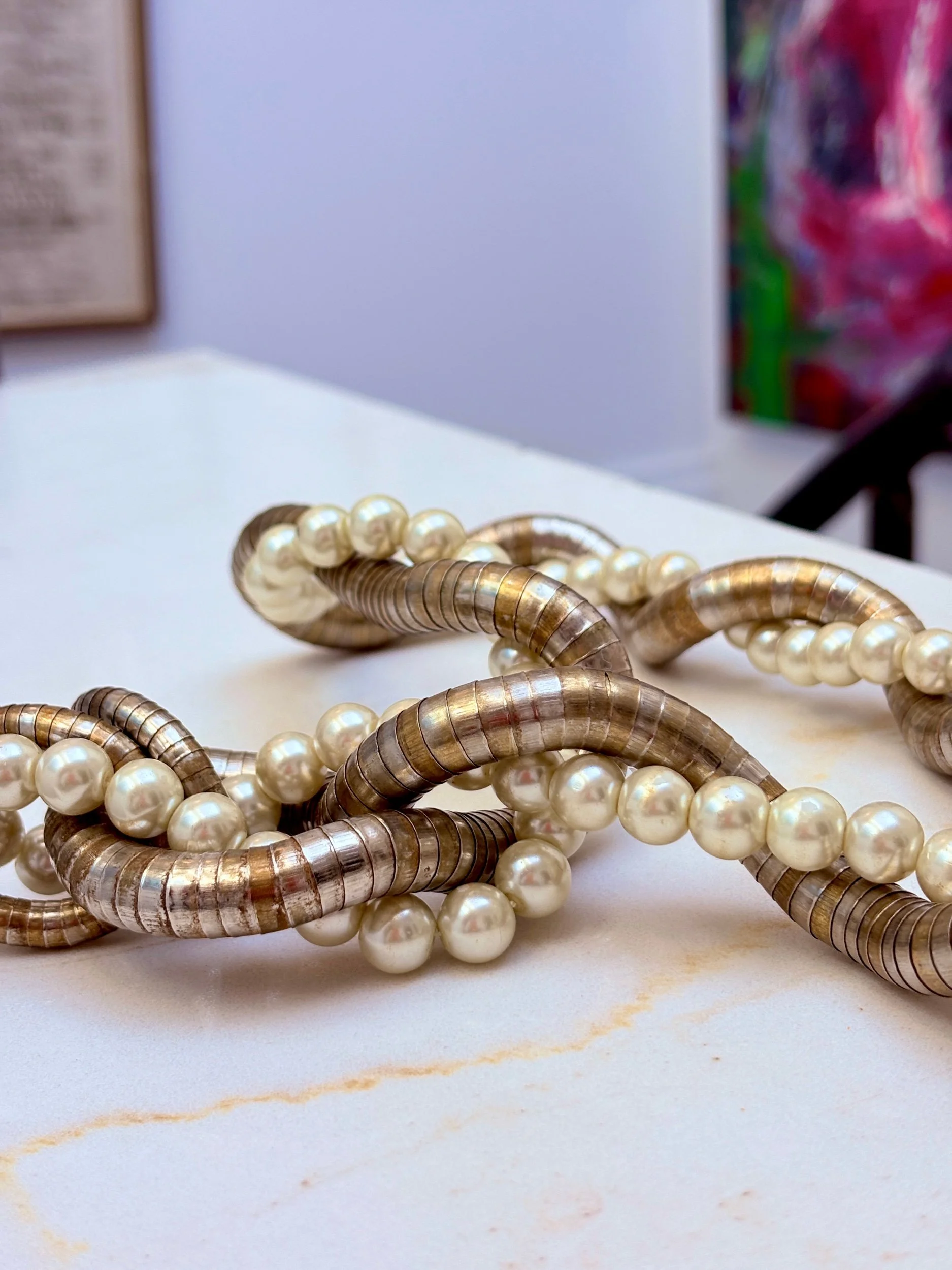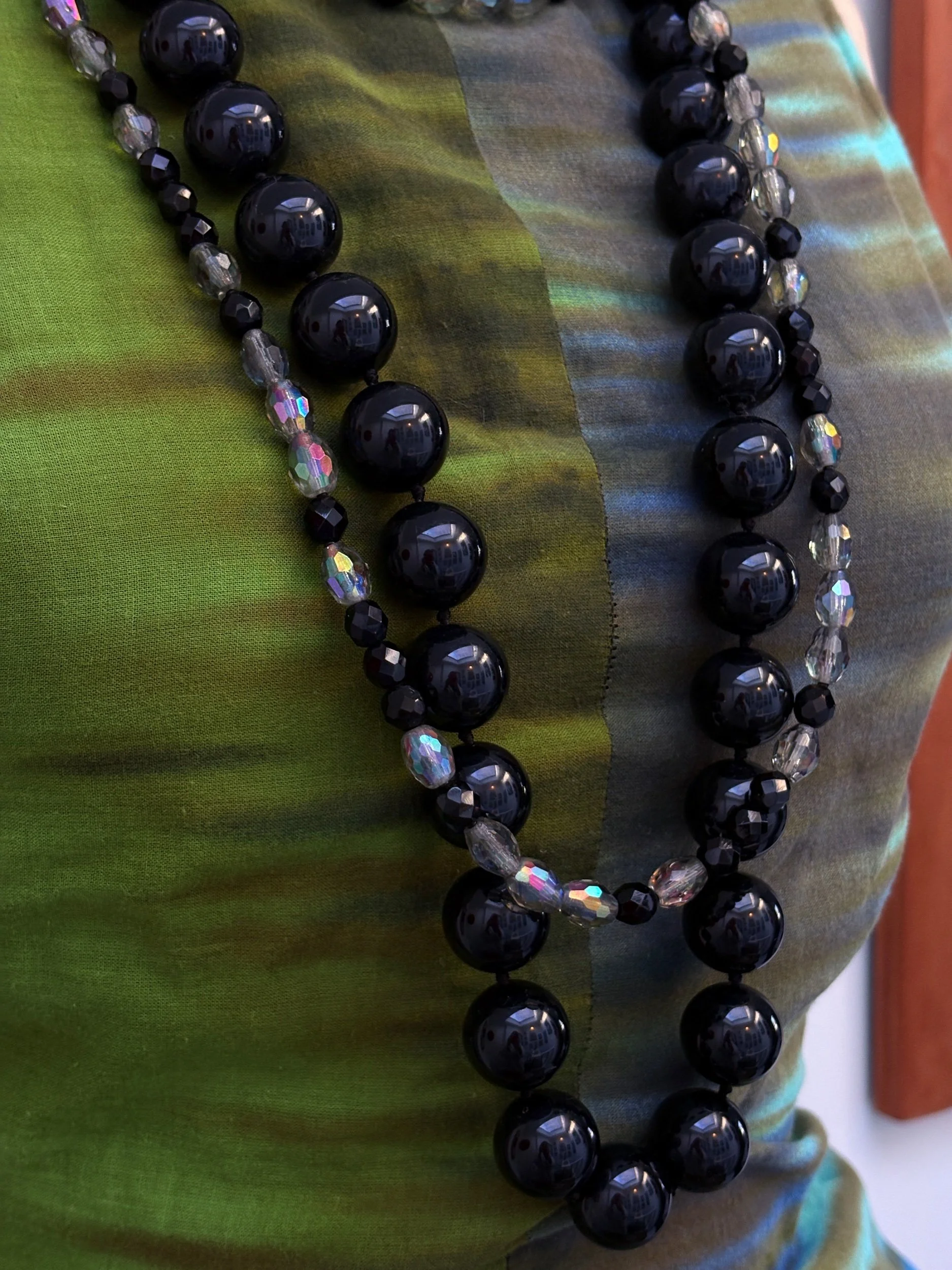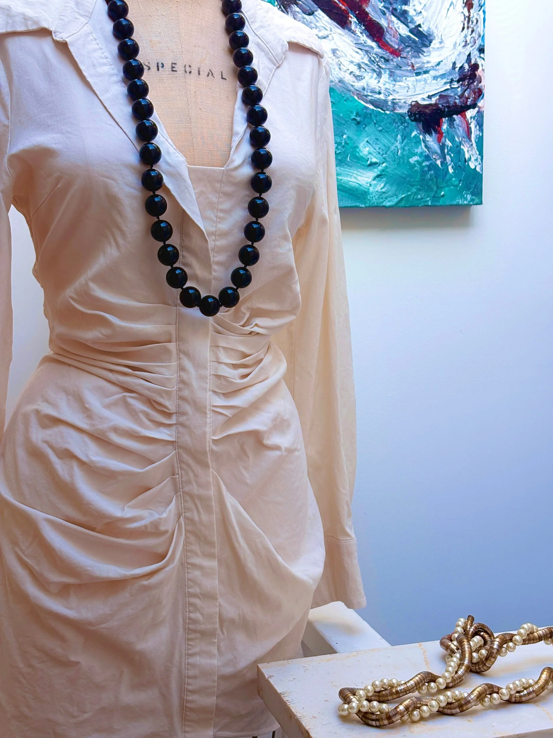 A dramatic opera-length strand composed of oversized glossy black beads, selected for its sculptural clarity and strong visual presence. The generous scale and deep reflective finish give the piece a polished, graphic quality that reads as both classic and boldly modern. Striking worn alone and equally effective layered into a more directional composition.DetailsVintage oversized black bead necklaceGlossy polished finishOpera-length silhouetteRounded bead form with substantial scaleDeep black tone with strong reflective surfaceReads as sculptural, graphic, and versatileVintage condition consistent with age and use