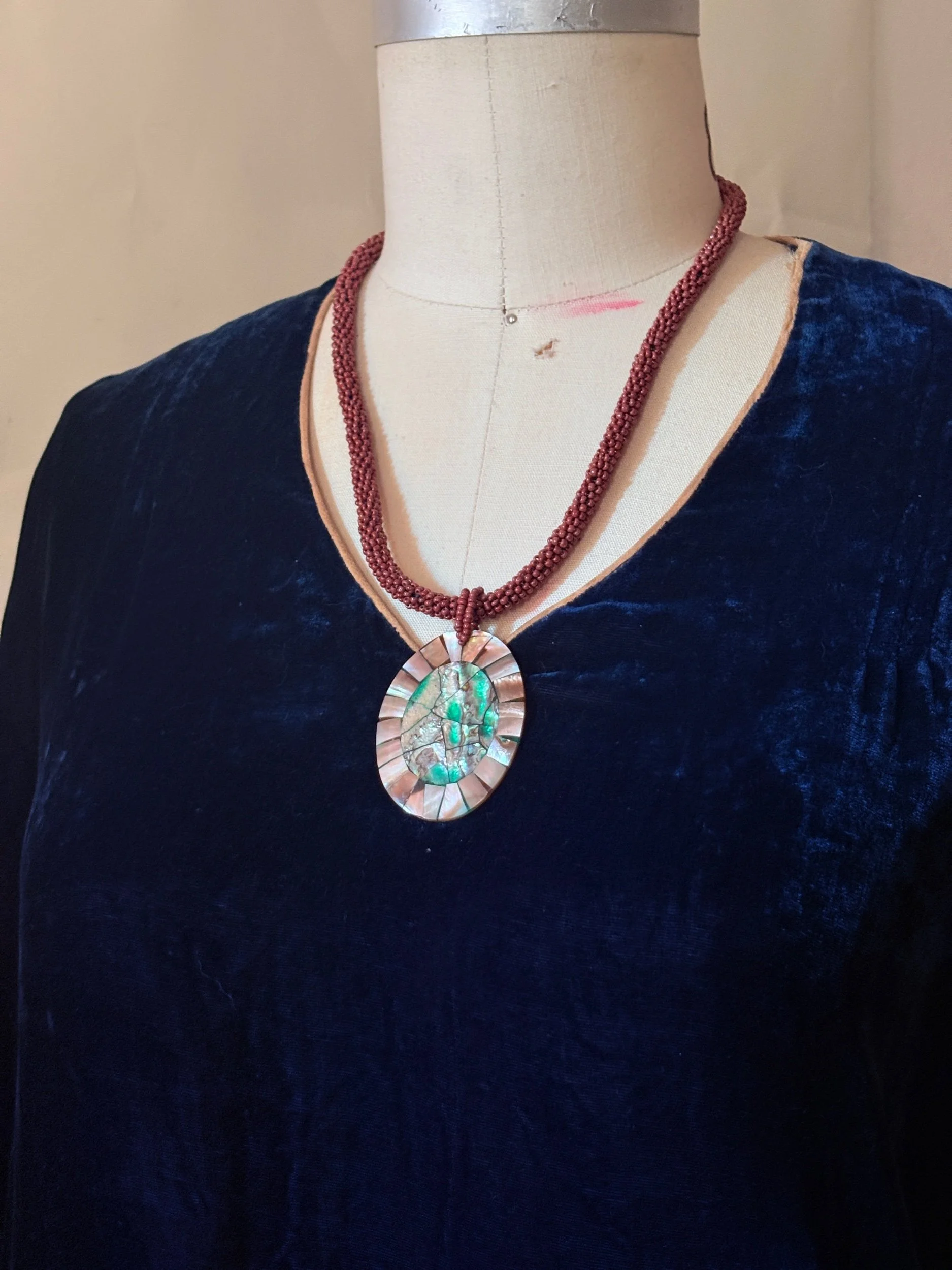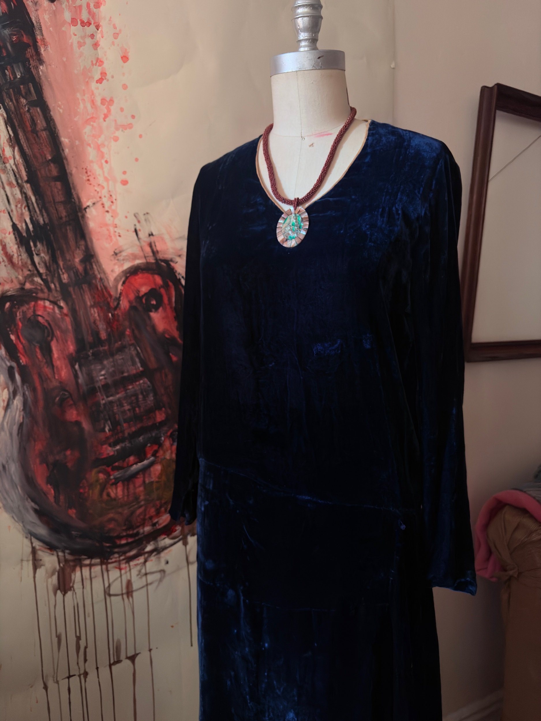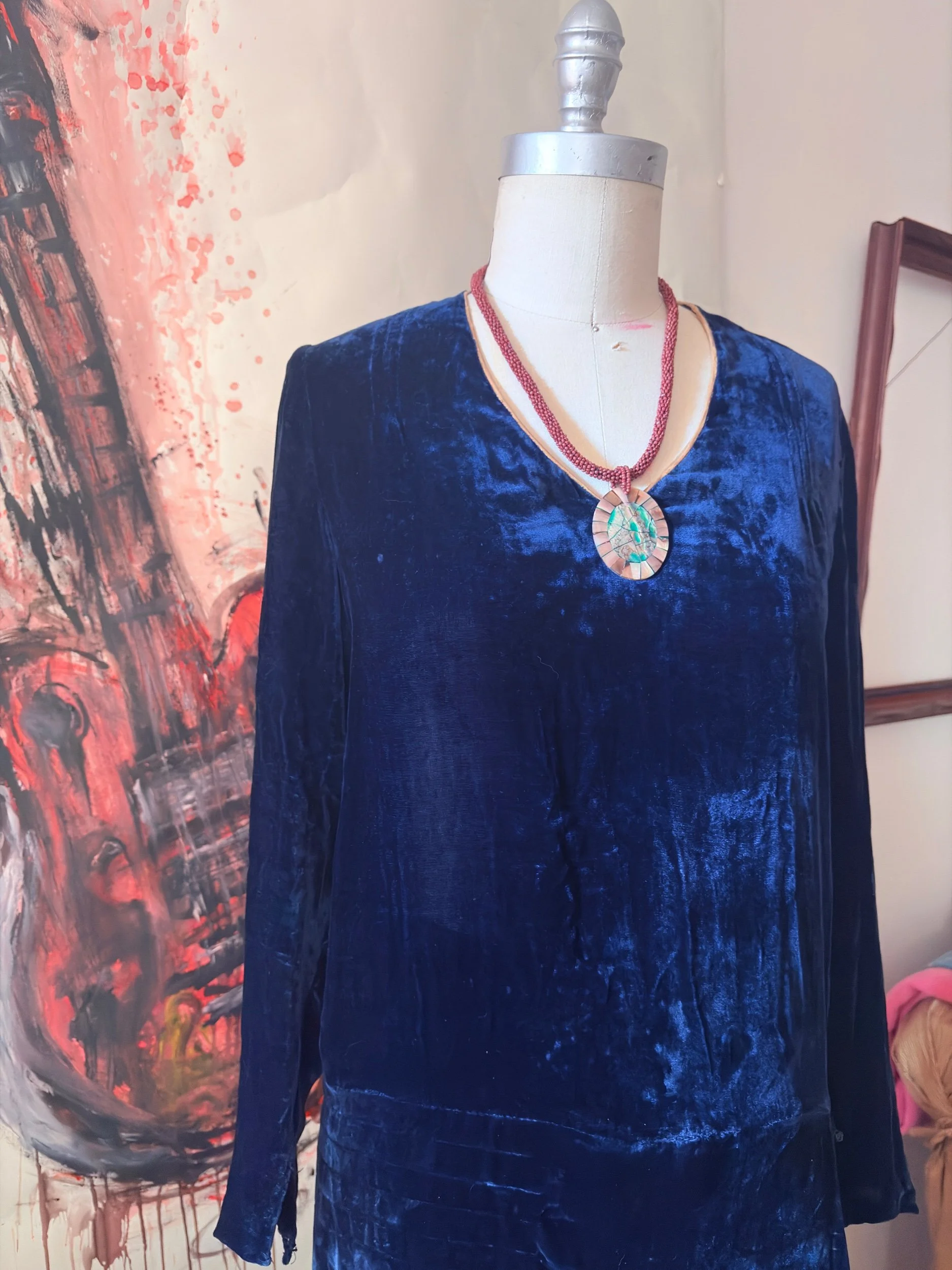 Styled here on vintage silk to highlight the soft tonal palette and fluid drape of the design.