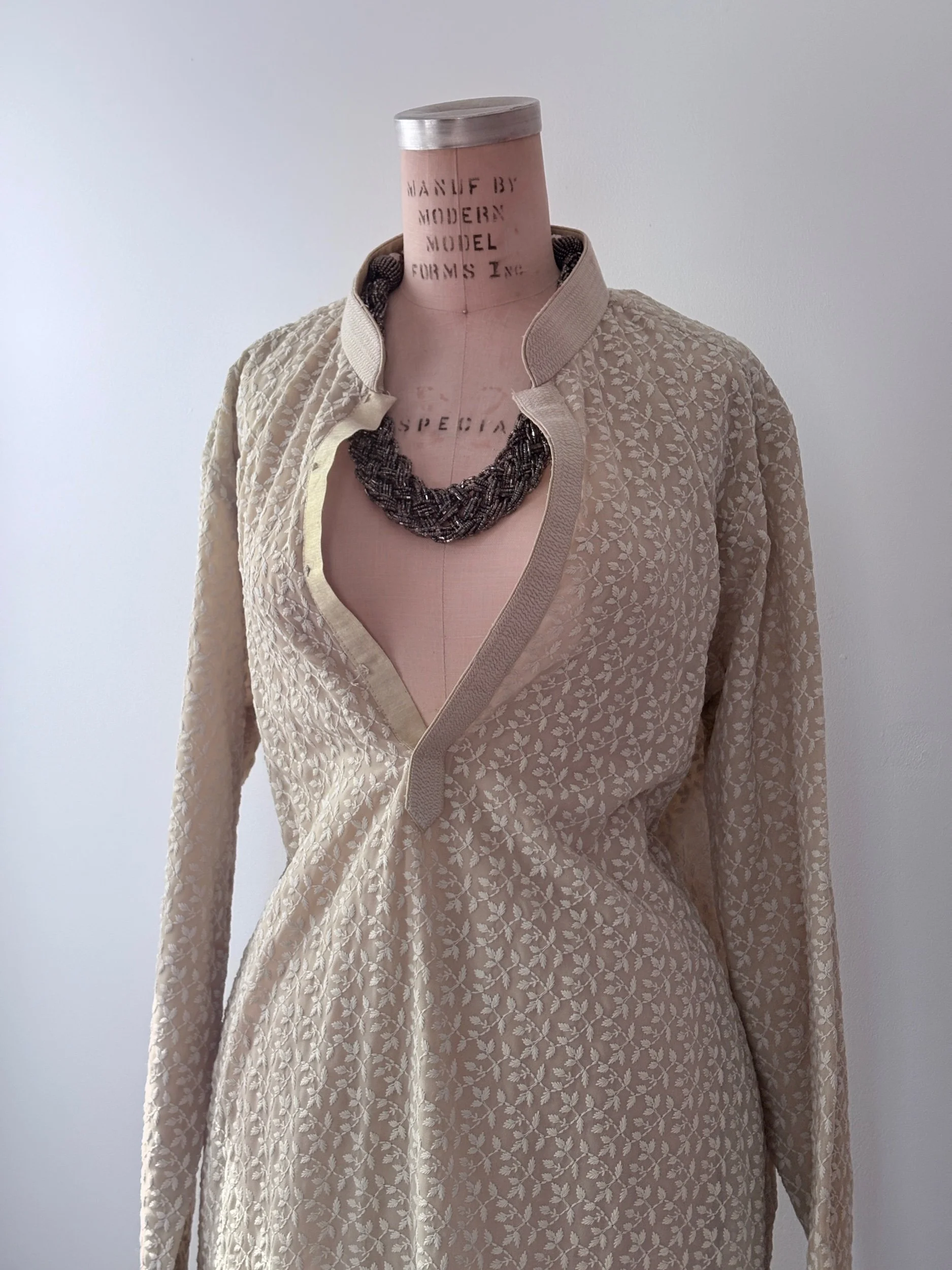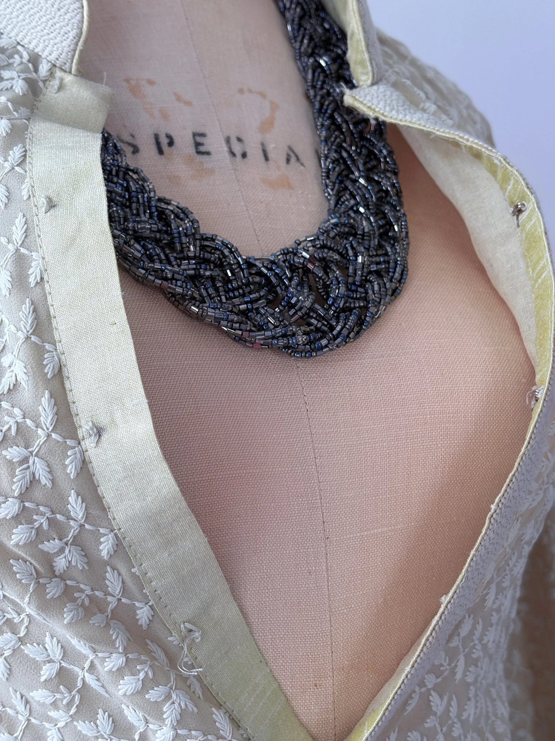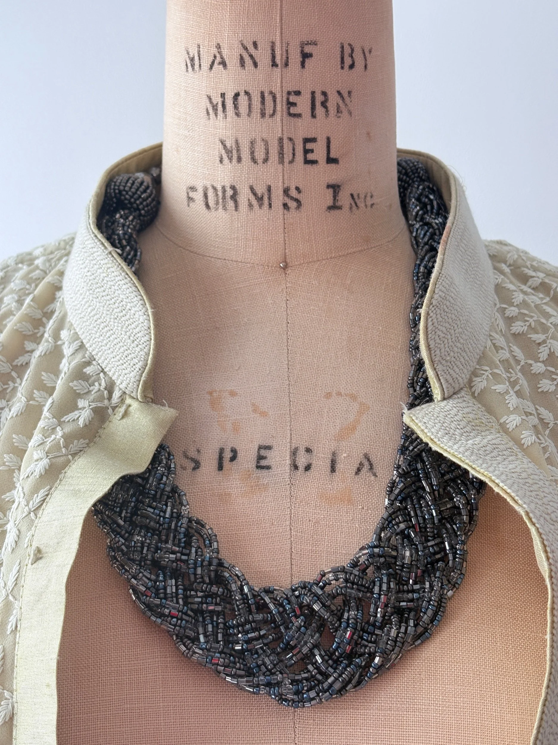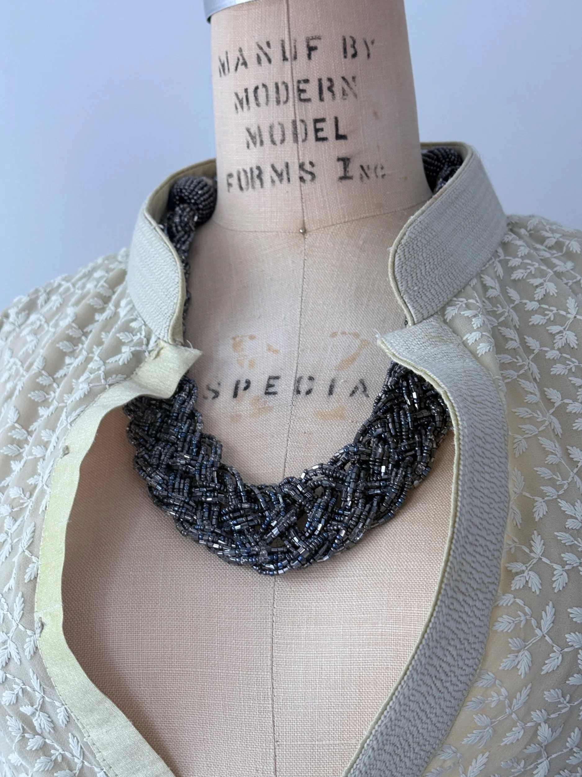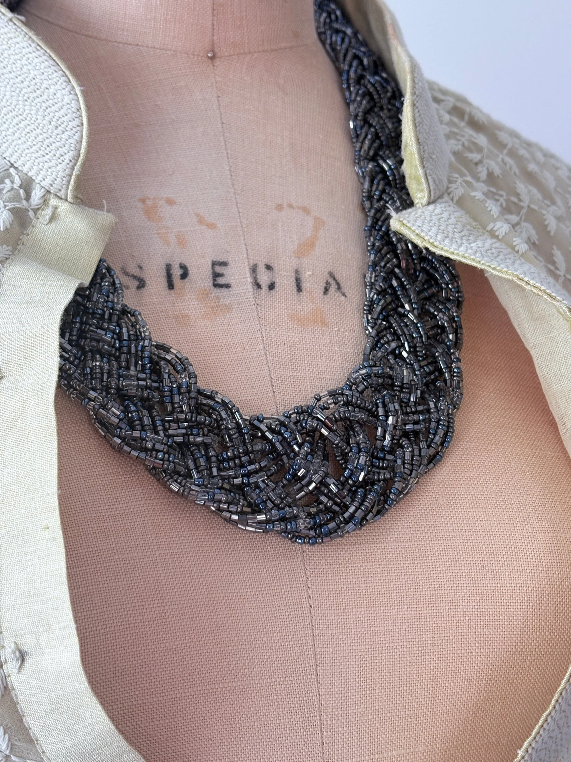 A sculptural vintage collar necklace composed of densely braided strands of dark gunmetal-toned beads. Rich in texture and softly dramatic in silhouette, it sits at the neckline with an architectural, editorial presence. The dark metallic finish gives it a moodier, more directional effect than a traditional statement necklace, making it especially striking for evening, tailored dressing, or a more unconventional bridal look.