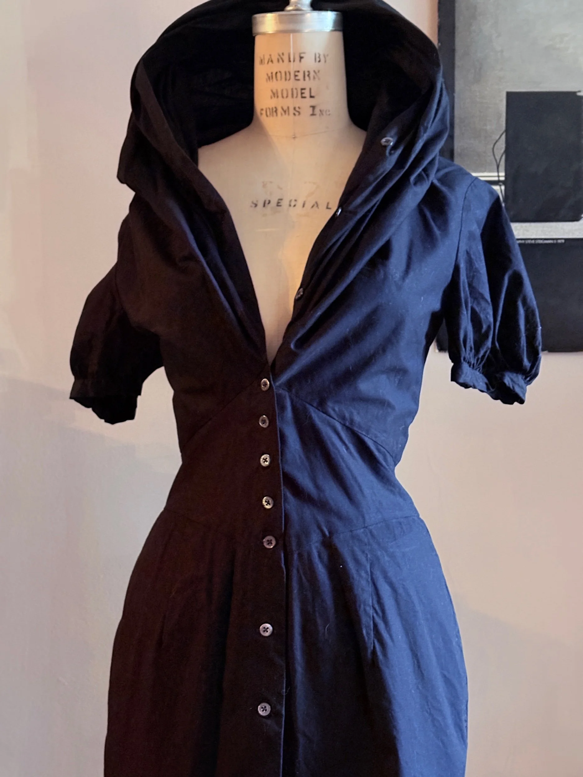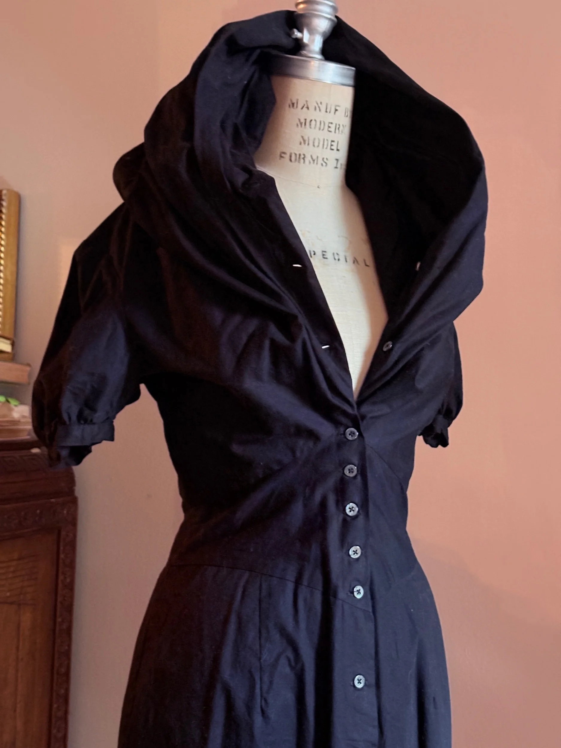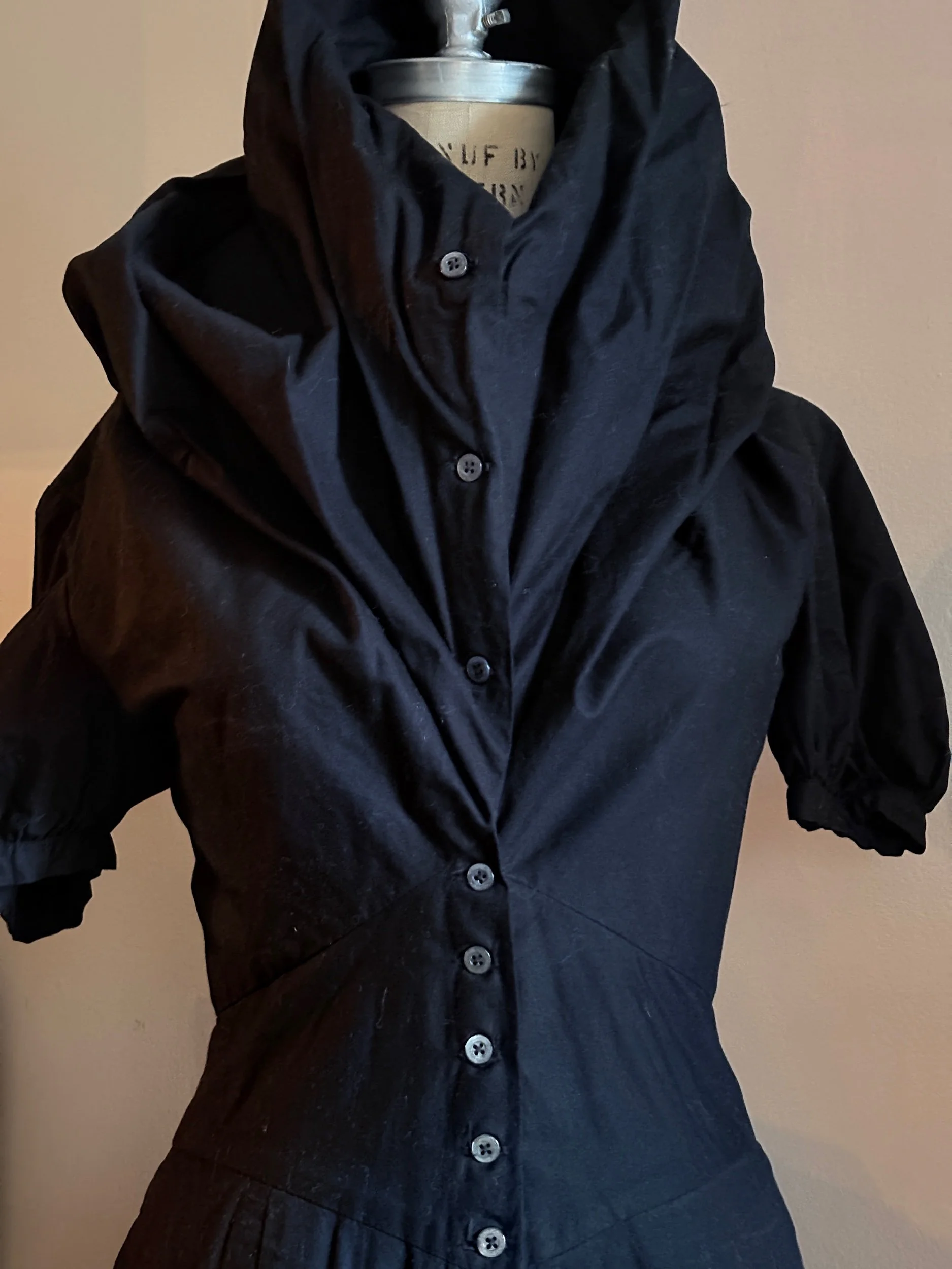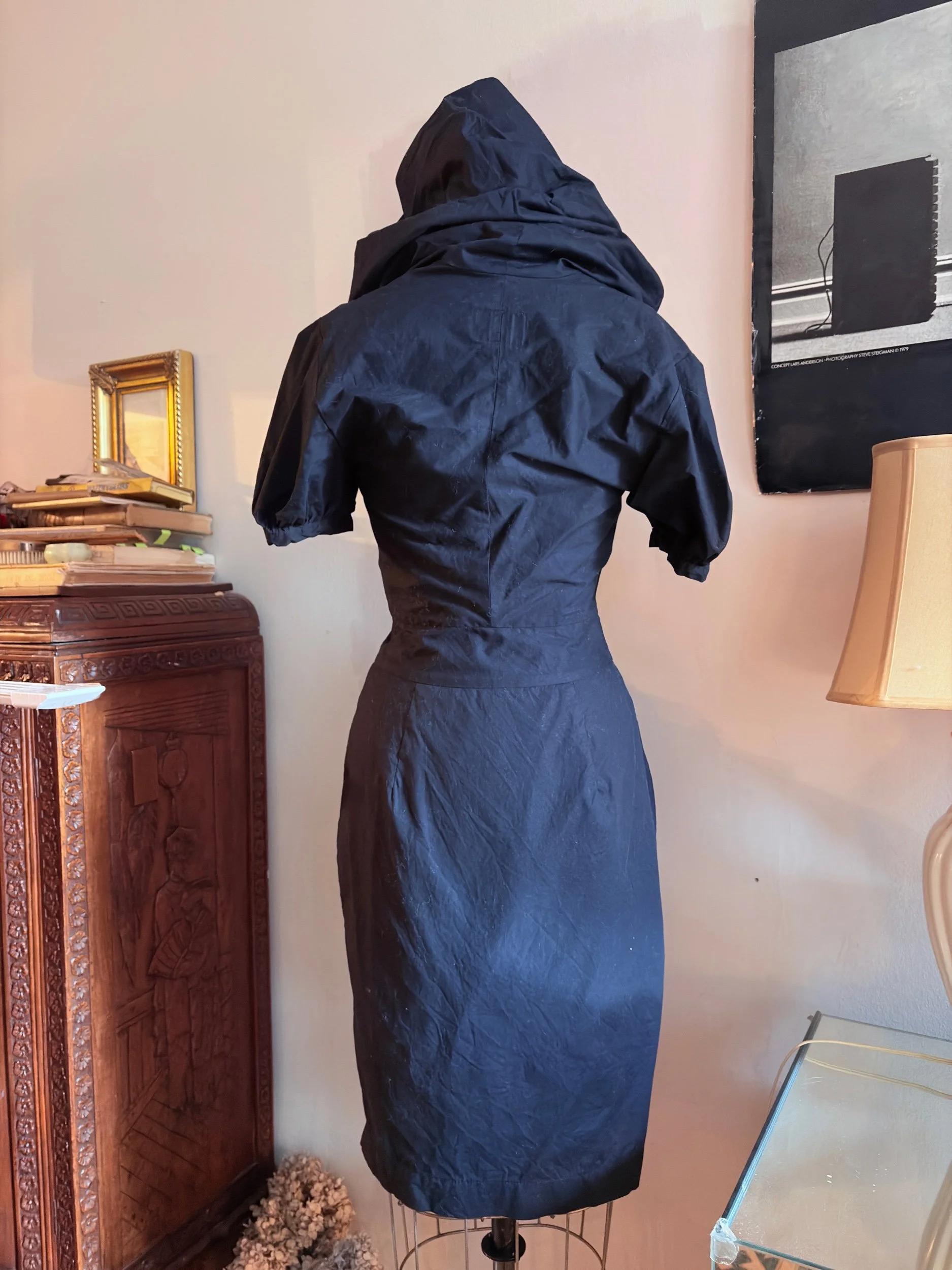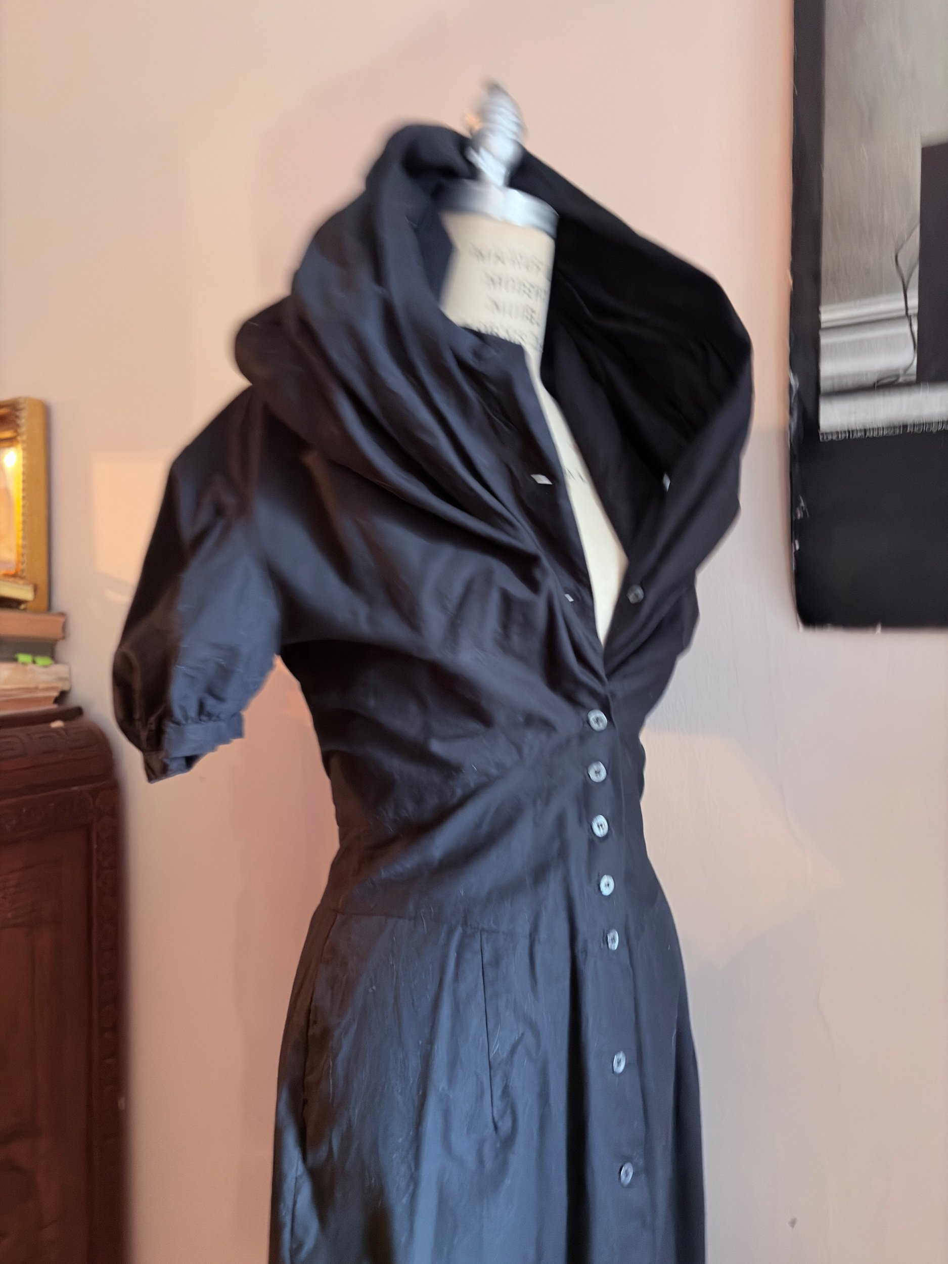 The piece demonstrates Westwood’s distinctive approach to tailoring: precise seamwork shapes the bodice in a corsetry-inspired construction before falling into a softly structured midi skirt. A dramatic oversized collar frames the neckline and may be styled open or raised into a sculptural hood.