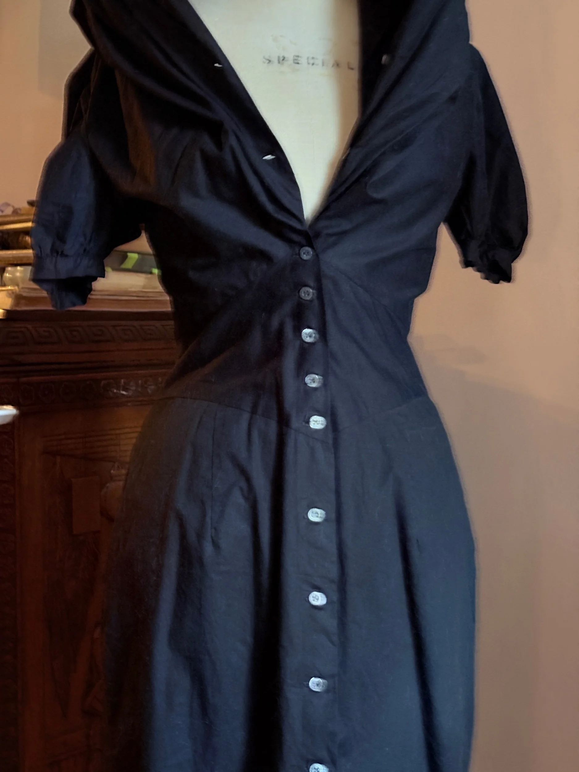 An architecturally tailored black dress by Vivienne Westwood from the celebrated Anglomania line, defined by its sculptural collar and sharply contoured waistline.